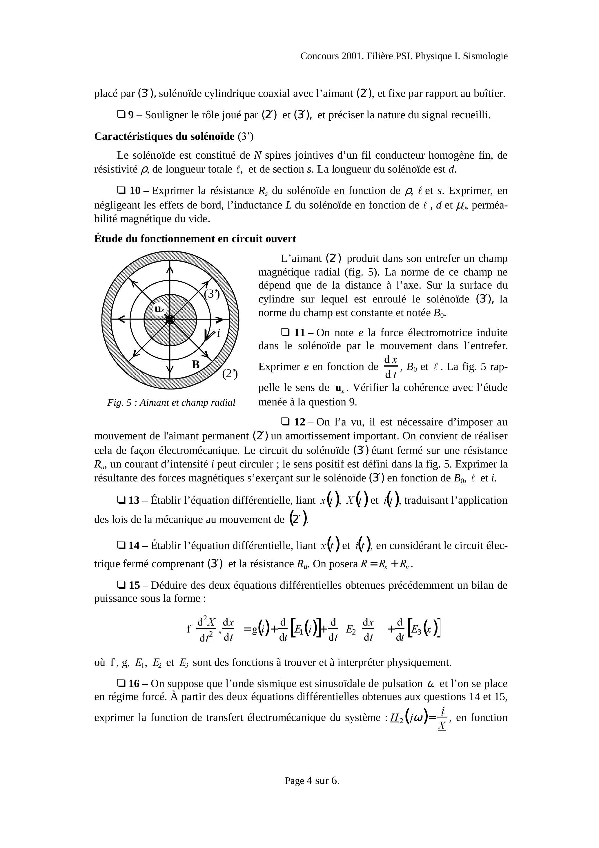 12 - On l'a vu, il est nécessaire d'imposer au mouvement de l'aimant permanent ( ) un amortissement important. On convient de réaliser cela de façon électromécanique. Le circuit du solénoïde (3) étant fermé sur une résistance , un courant d'intensité peut circuler ; le sens positif est défini dans la fig. 5. Exprimer la résultante des forces magnétiques s’exerçant sur le solénoïde (3) en fonction de et . - Établir l'équation différentielle, liant et , traduisant l’application des lois de la mécanique au mouvement de . - Établir l'équation différentielle, liant et , en considérant le circuit électrique fermé comprenant (3') et la résistance . On posera .