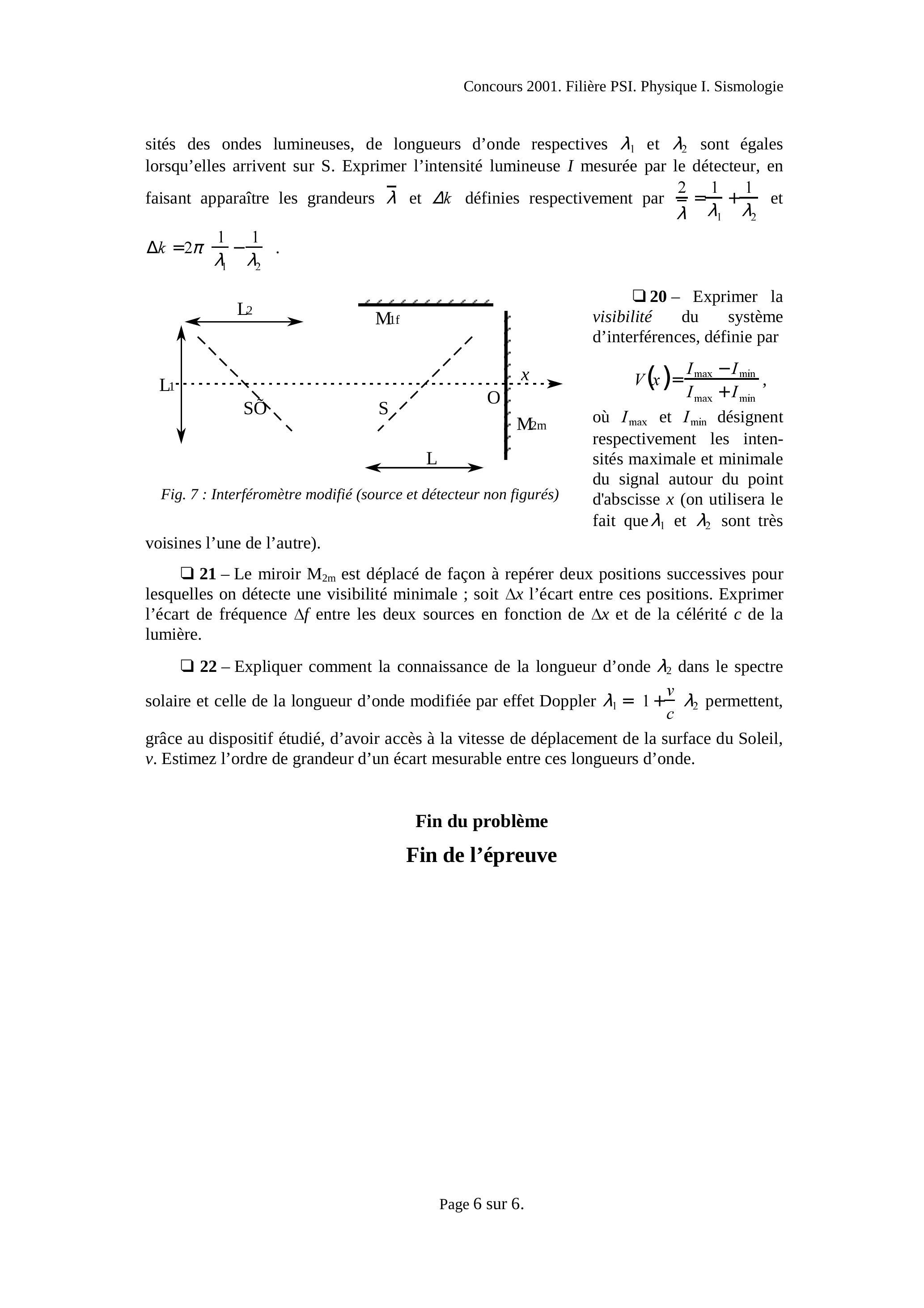 21 - Le miroir est déplacé de façon à repérer deux positions successives pour lesquelles on détecte une visibilité minimale ; soit l'écart entre ces positions. Exprimer l'écart de fréquence entre les deux sources en fonction de et de la célérité de la lumière.