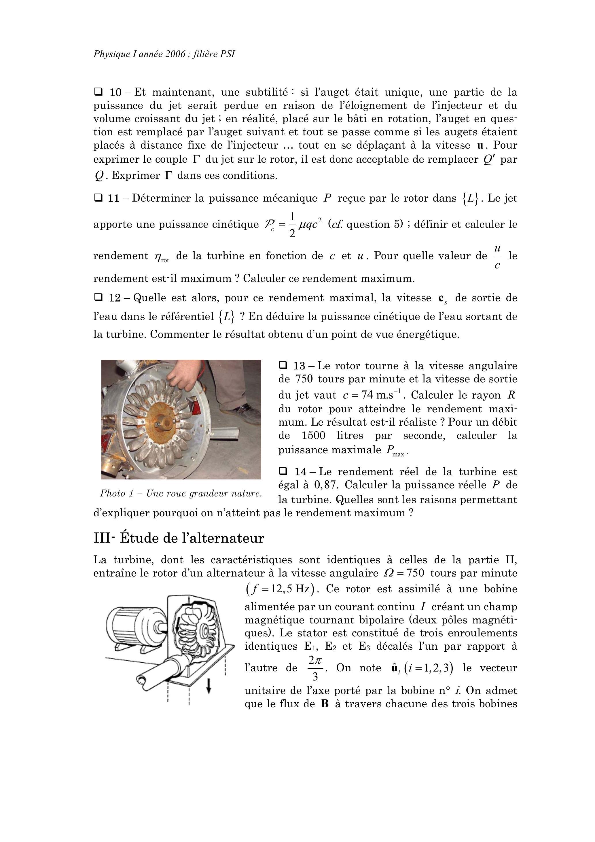 La turbine, dont les caractéristiques sont identiques à celles de la partie II, entraîne le rotor d'un alternateur à la vitesse angulaire tours par minute . Ce rotor est assimilé à une bobine
