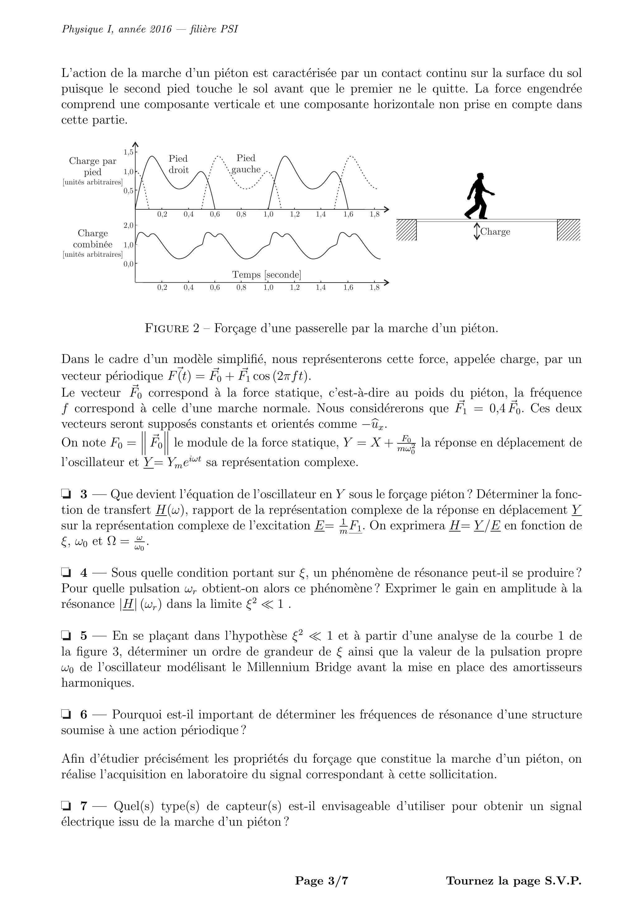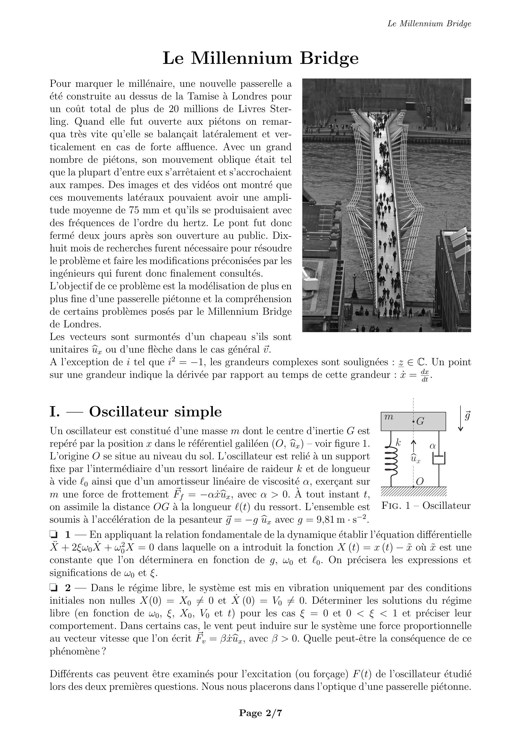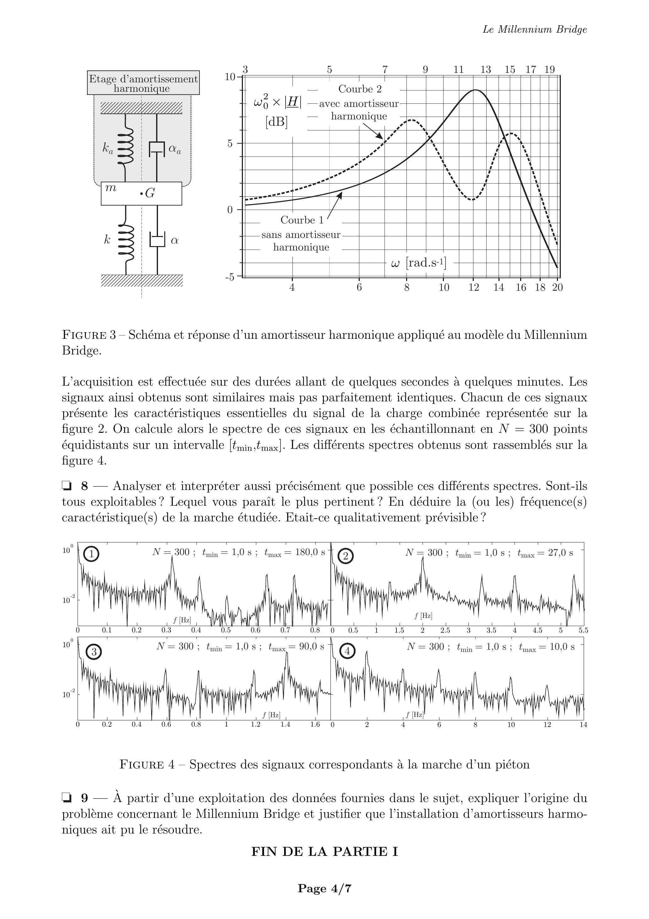 • 9 - À partir d'une exploitation des données fournies dans le sujet, expliquer l'origine du problème concernant le Millennium Bridge et justifier que l'installation d'amortisseurs harmoniques ait pu le résoudre.