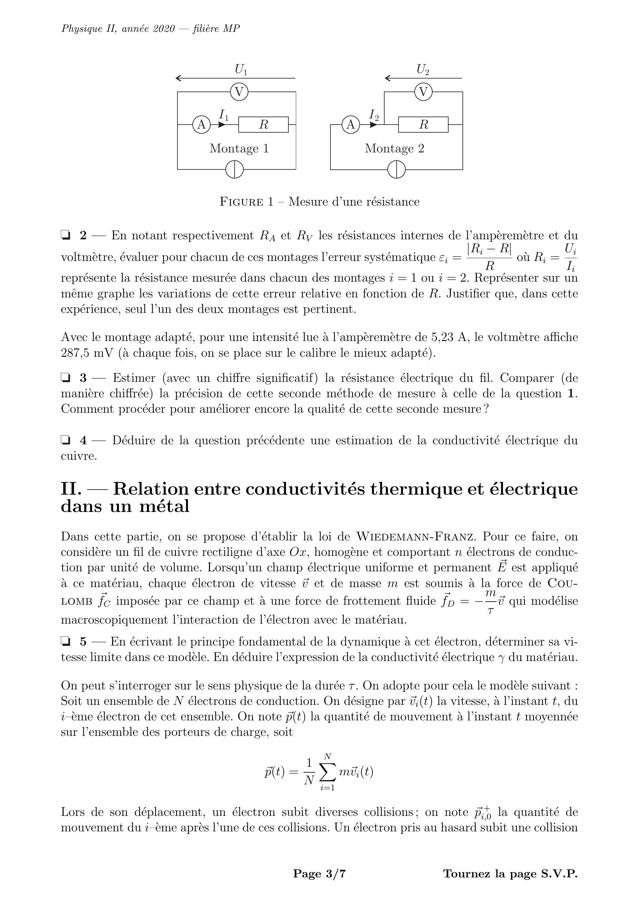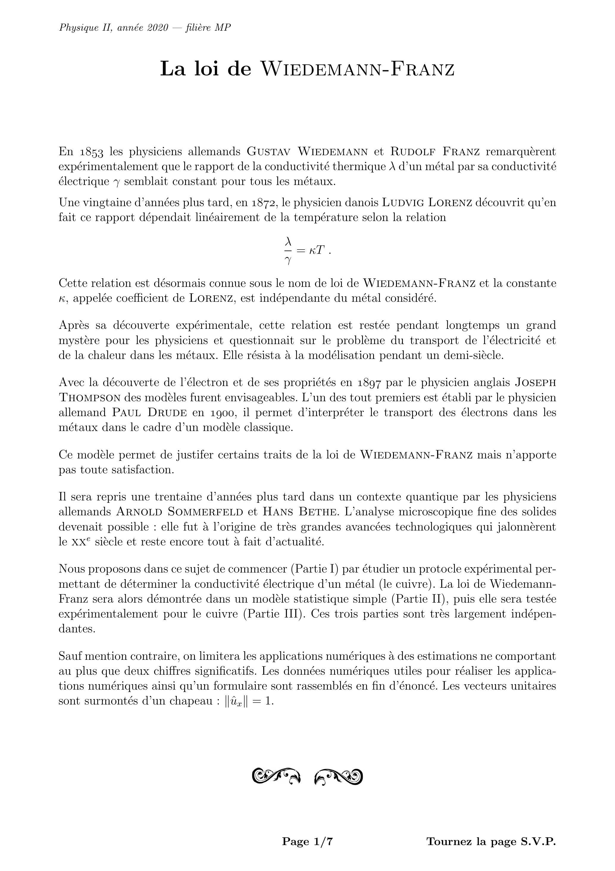 Nous proposons dans ce sujet de commencer (Partie I) par étudier un protocle expérimental permettant de déterminer la conductivité électrique d'un métal (le cuivre). La loi de WiedemannFranz sera alors démontrée dans un modèle statistique simple (Partie II), puis elle sera testée expérimentalement pour le cuivre (Partie III). Ces trois parties sont très largement indépendantes.