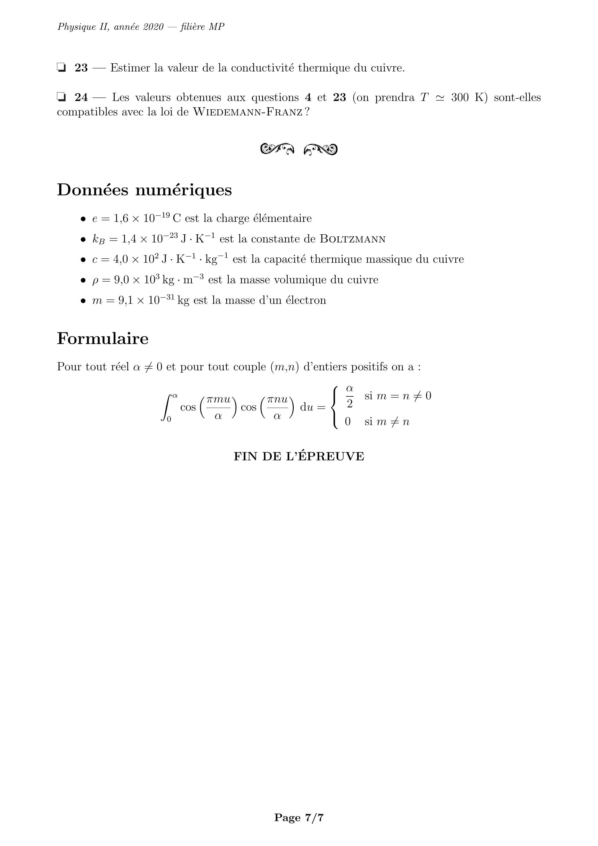 - Estimer la valeur de la conductivité thermique du cuivre. - Les valeurs obtenues aux questions 4 et 23 (on prendra ) sont-elles compatibles avec la loi de Wiedemann-Franz?
