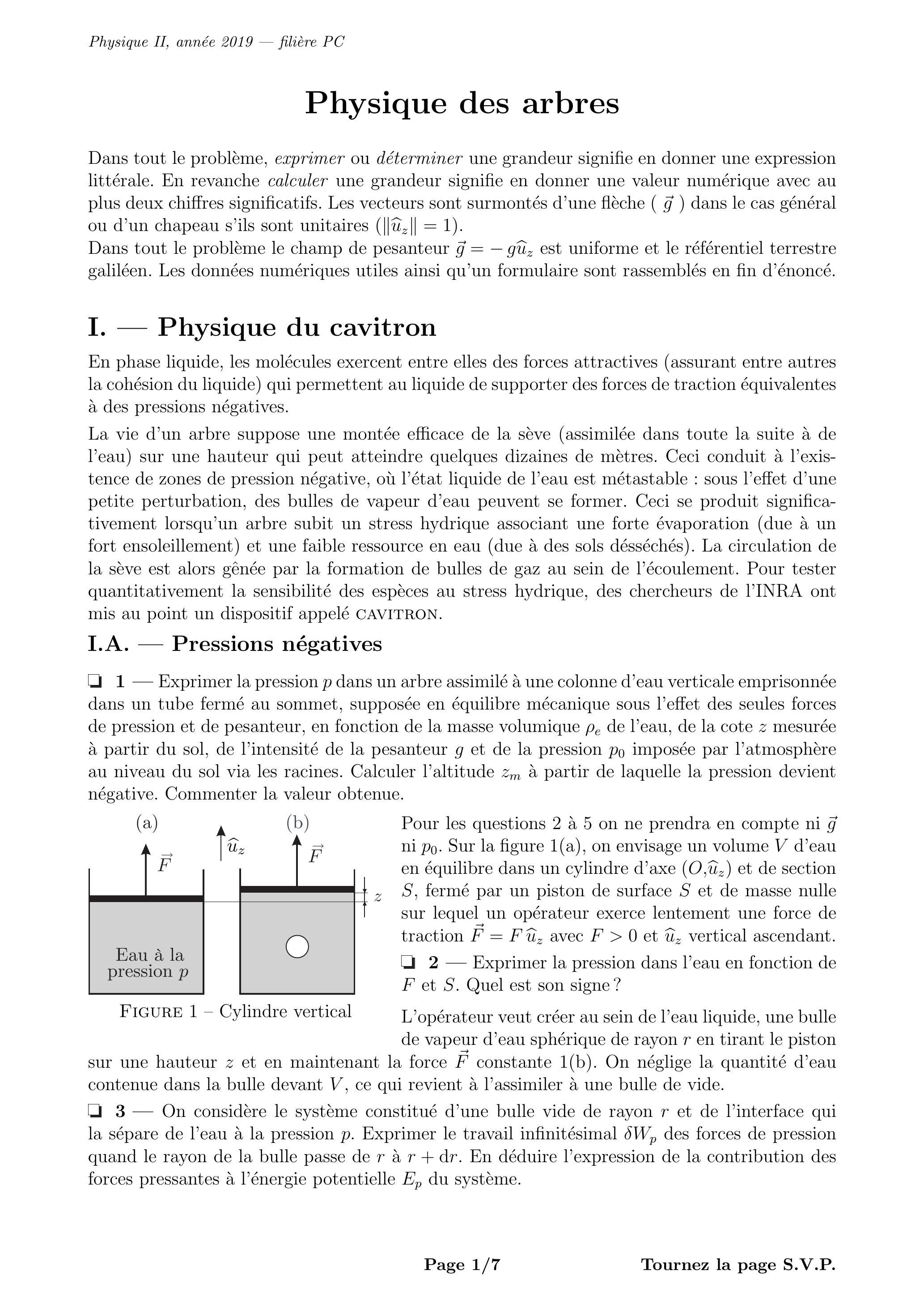 1 - Exprimer la pression dans un arbre assimilé à une colonne d'eau verticale emprisonnée dans un tube fermé au sommet, supposée en équilibre mécanique sous l'effet des seules forces de pression et de pesanteur, en fonction de la masse volumique de l'eau, de la cote mesurée à partir du sol, de l'intensité de la pesanteur et de la pression imposée par l'atmosphère au niveau du sol via les racines. Calculer l'altitude à partir de laquelle la pression devient négative. Commenter la valeur obtenue.