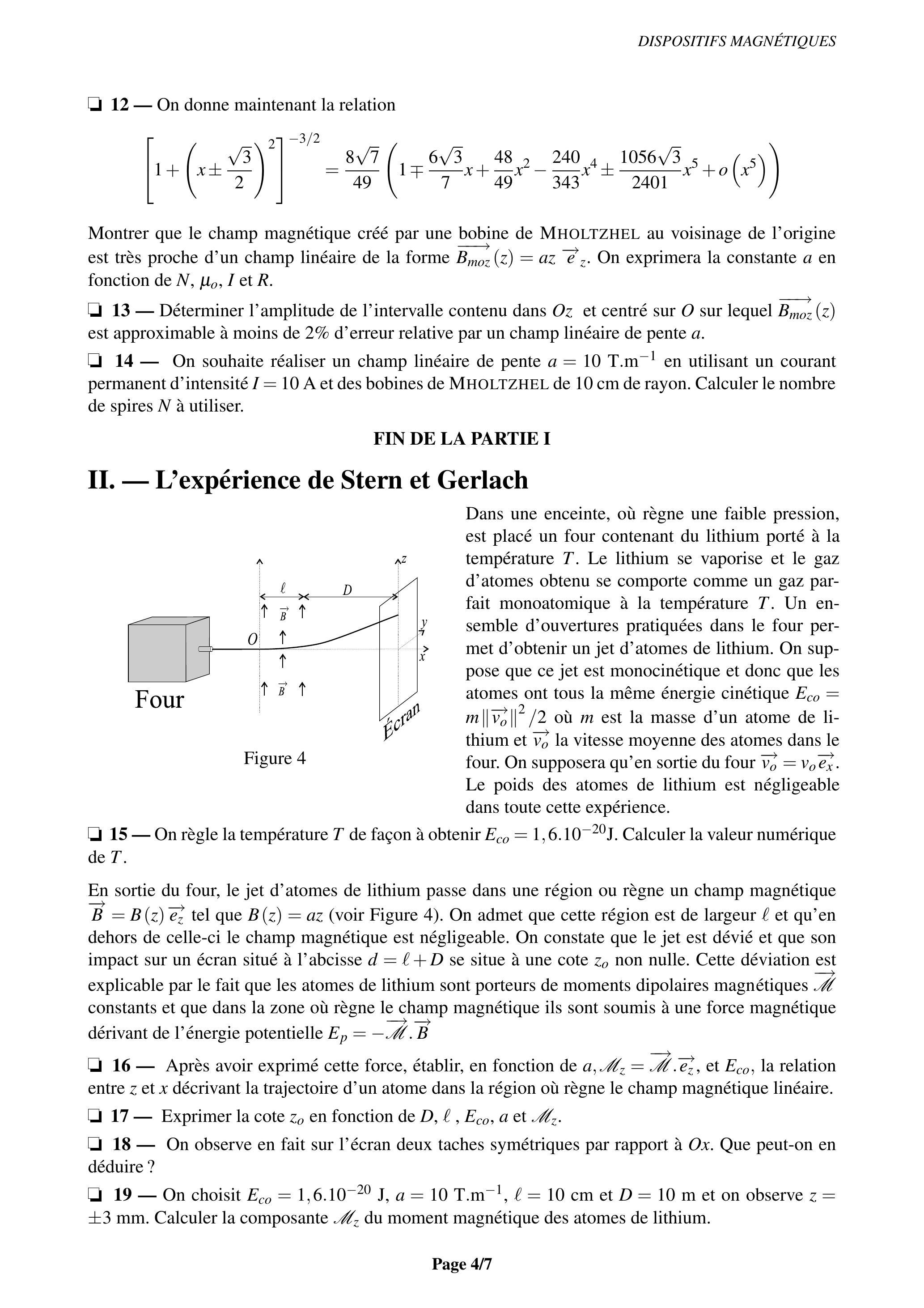 En sortie du four, le jet d'atomes de lithium passe dans une région ou règne un champ magnétique tel que (voir Figure 4). On admet que cette région est de largeur et qu'en dehors de celle-ci le champ magnétique est négligeable. On constate que le jet est dévié et que son impact sur un écran situé à l'abcisse se situe à une cote non nulle. Cette déviation est explicable par le fait que les atomes de lithium sont porteurs de moments dipolaires magnétiques constants et que dans la zone où règne le champ magnétique ils sont soumis à une force magnétique dérivant de l'énergie potentielle
