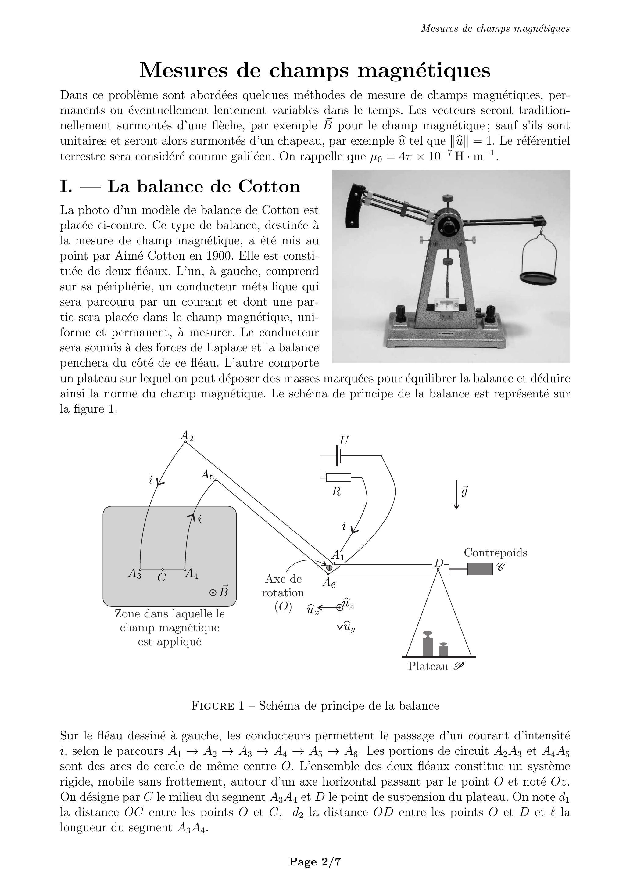 La photo d'un modèle de balance de Cotton est placée ci-contre. Ce type de balance, destinée à la mesure de champ magnétique, a été mis au point par Aimé Cotton en 1900. Elle est constituée de deux fléaux. L'un, à gauche, comprend sur sa périphérie, un conducteur métallique qui sera parcouru par un courant et dont une partie sera placée dans le champ magnétique, uniforme et permanent, à mesurer. Le conducteur sera soumis à des forces de Laplace et la balance penchera du côté de ce fléau. L'autre comporte
