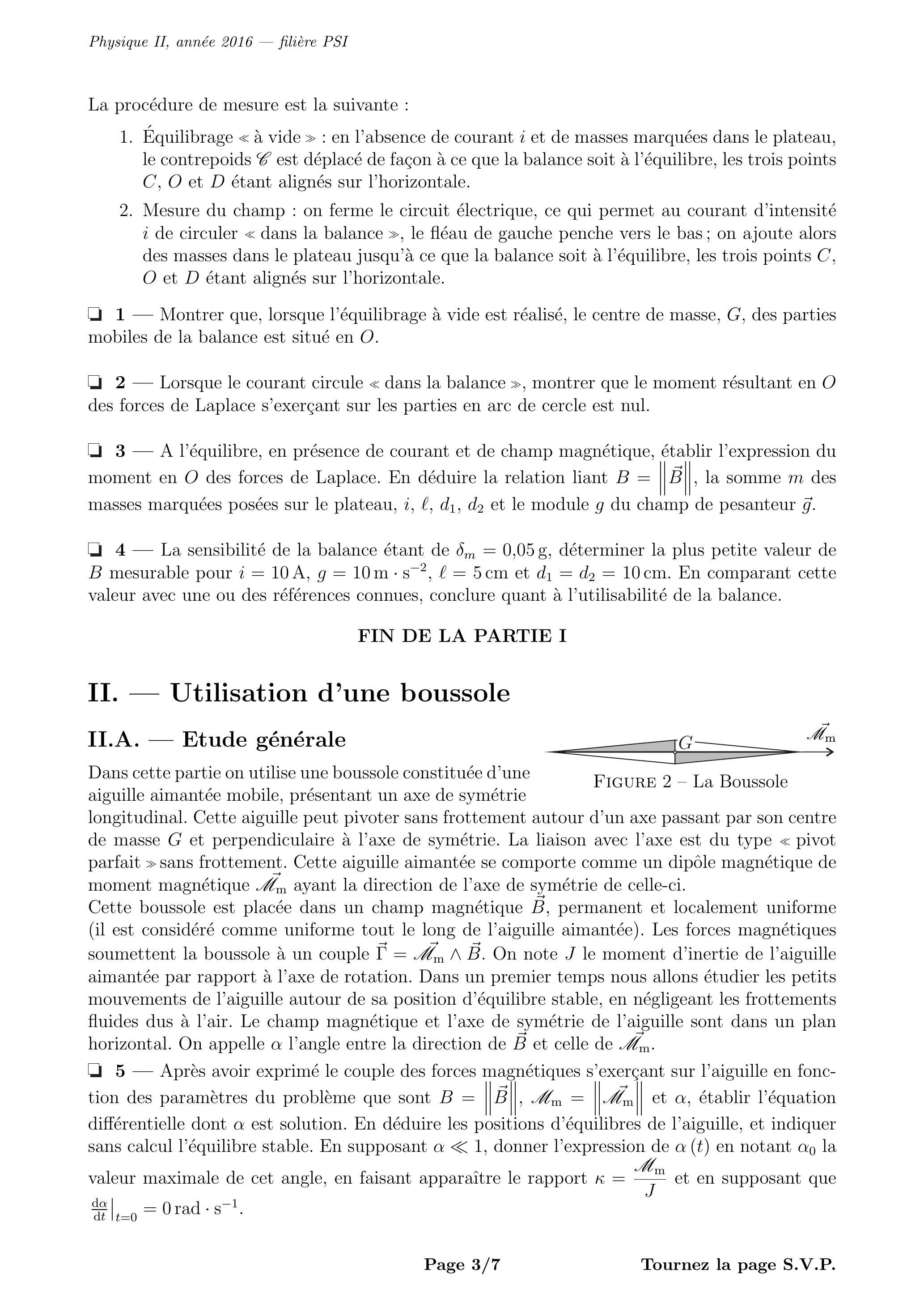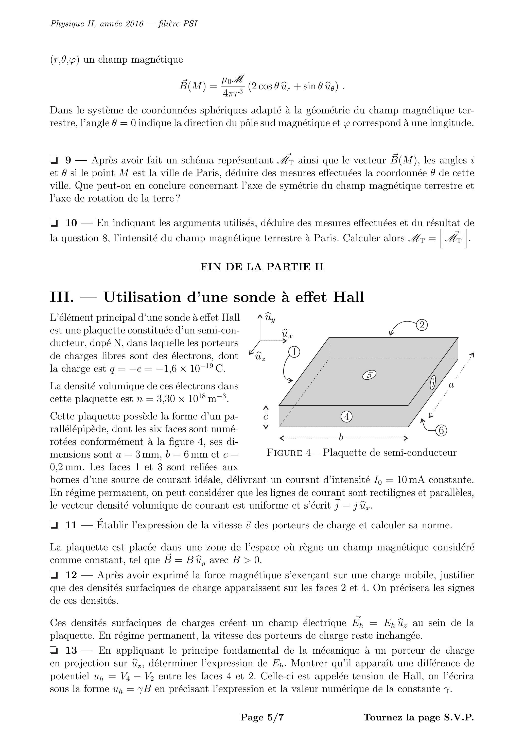 Dans ce problème sont abordées quelques méthodes de mesure de champs magnétiques, permanents ou éventuellement lentement variables dans le temps. Les vecteurs seront traditionnellement surmontés d'une flèche, par exemple pour le champ magnétique; sauf s'ils sont unitaires et seront alors surmontés d'un chapeau, par exemple tel que . Le référentiel terrestre sera considéré comme galiléen. On rappelle que .