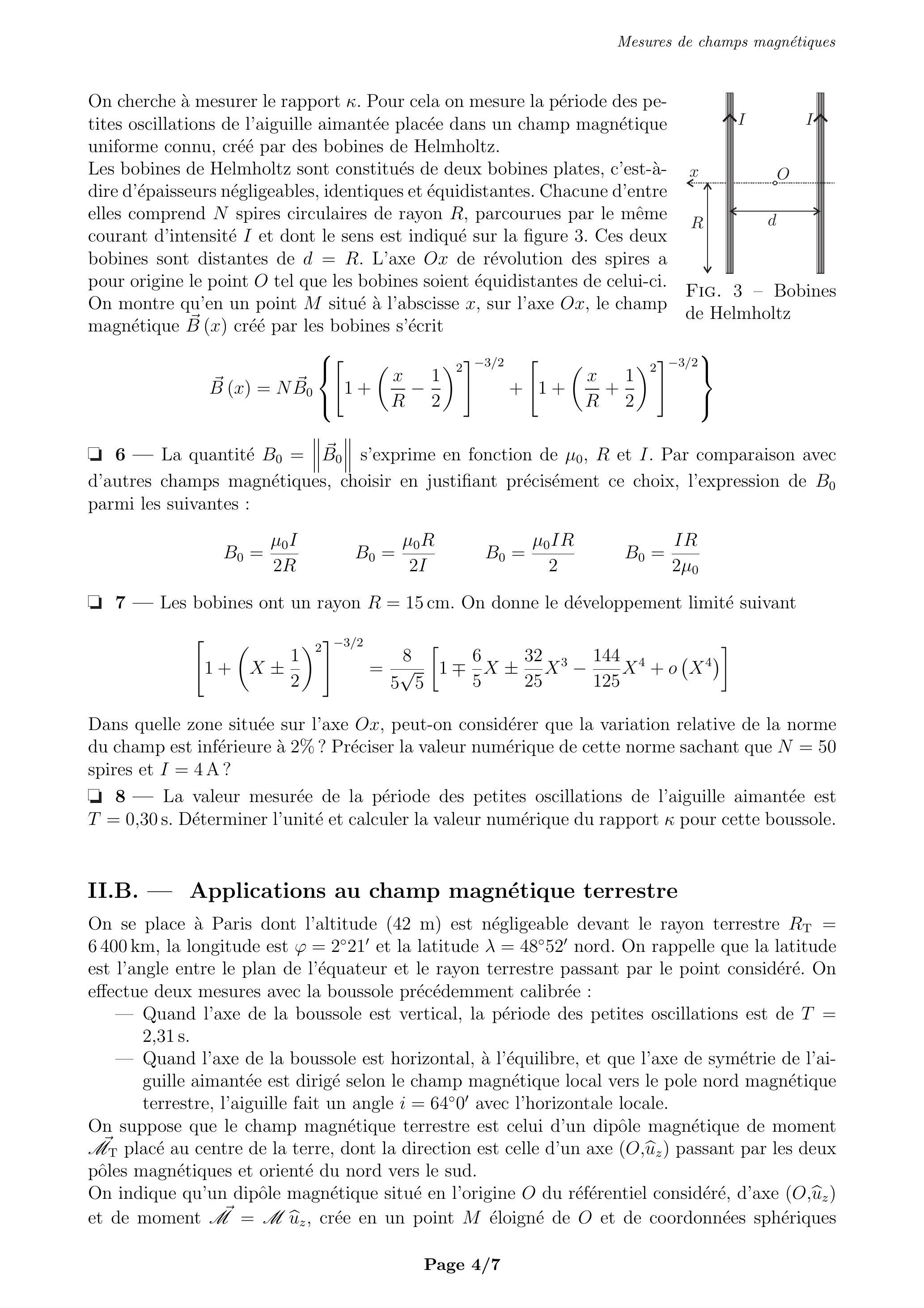 On cherche à mesurer le rapport . Pour cela on mesure la période des petites oscillations de l'aiguille aimantée placée dans un champ magnétique uniforme connu, créé par des bobines de Helmholtz.