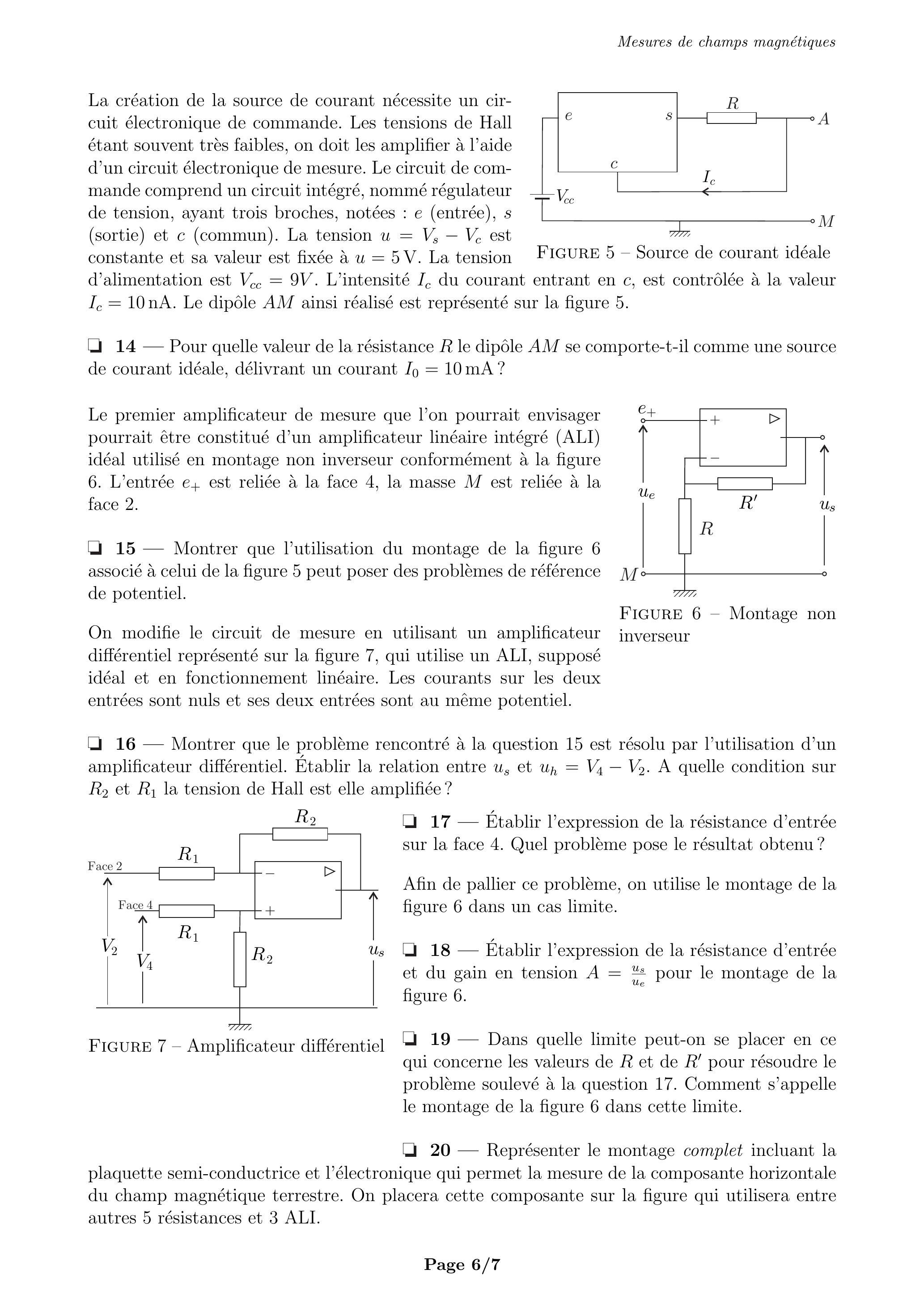 16- Montrer que le problème rencontré à la question 15 est résolu par l'utilisation d'un amplificateur différentiel. Établir la relation entre et . A quelle condition sur et la tension de Hall est elle amplifiée?