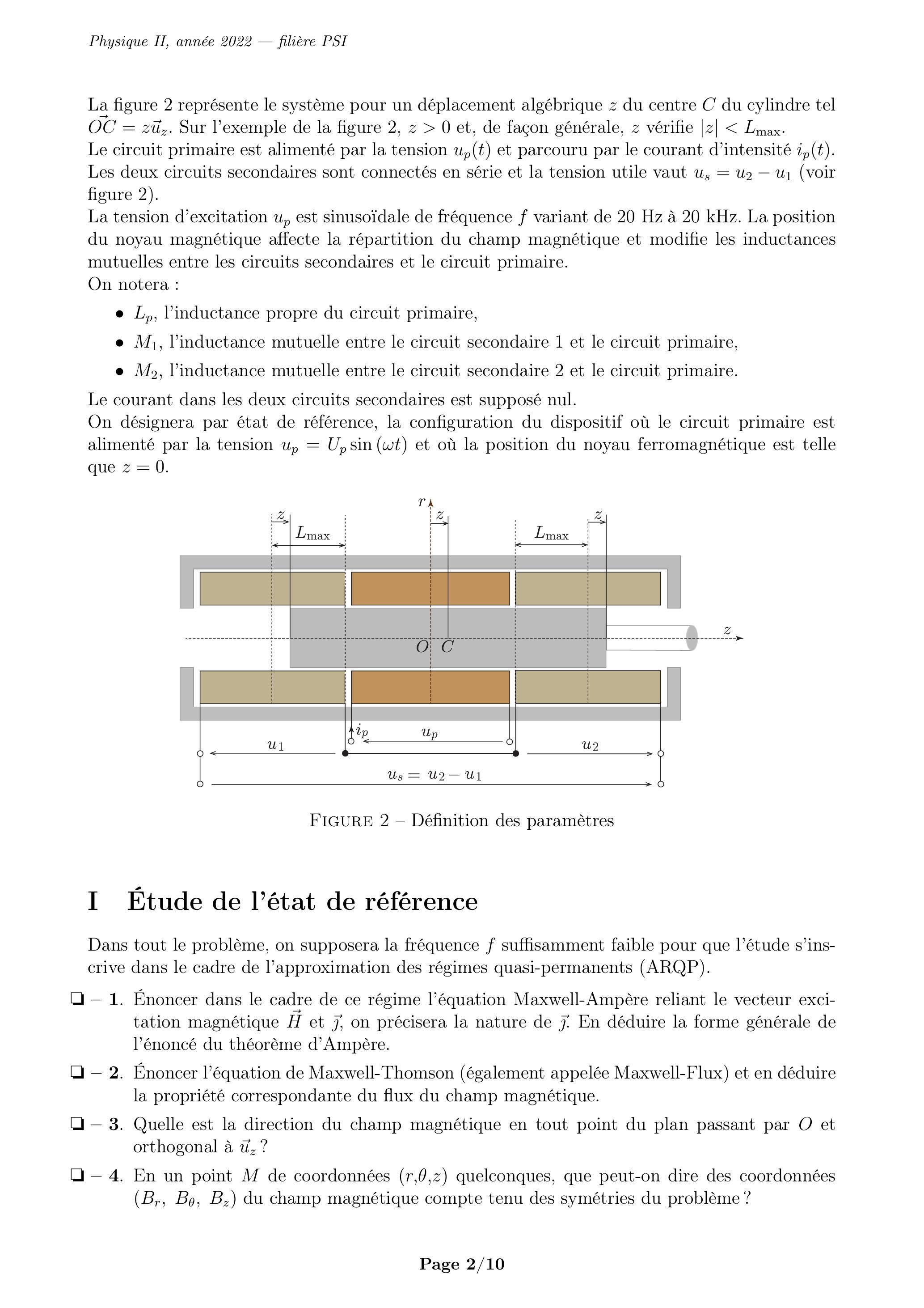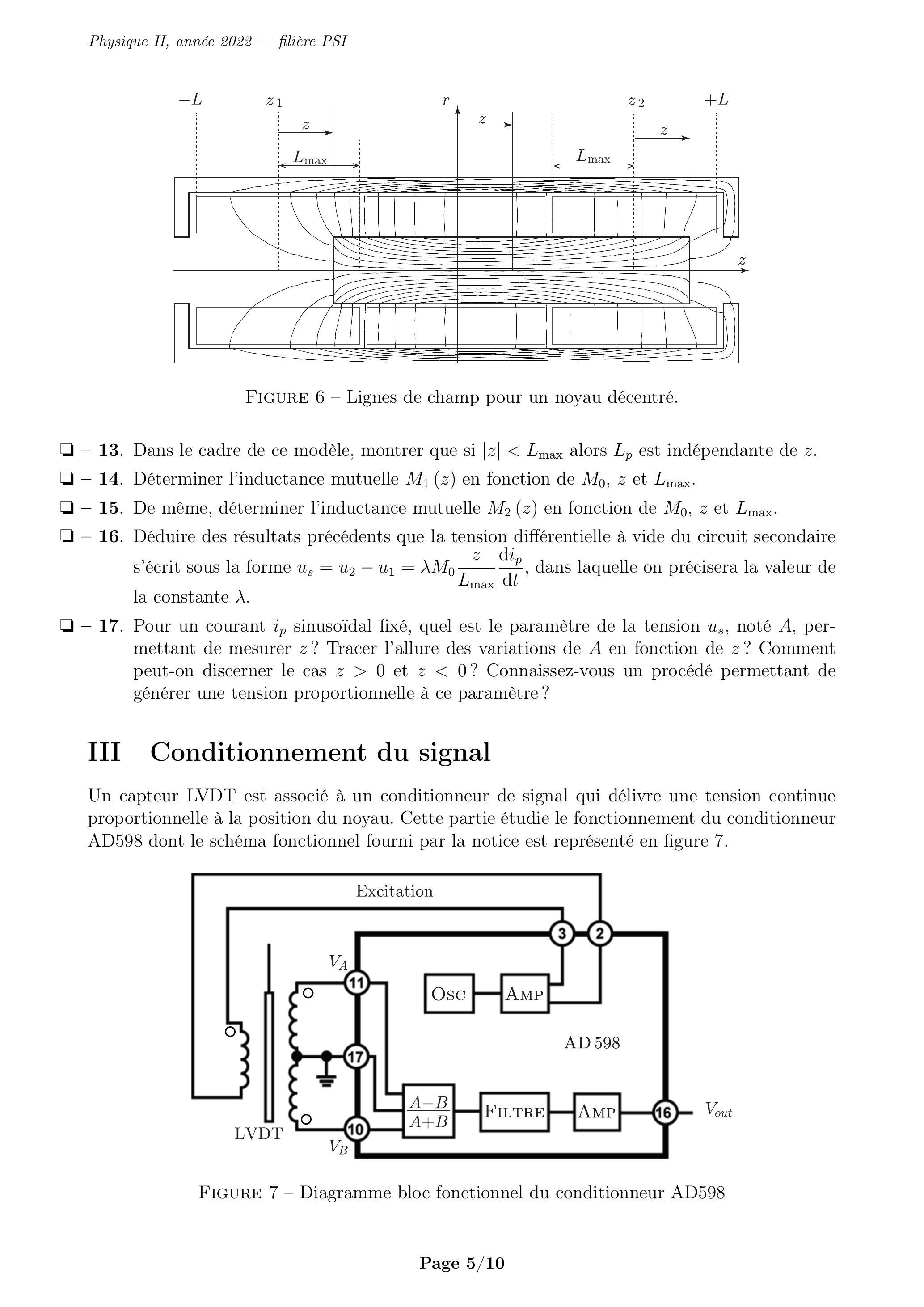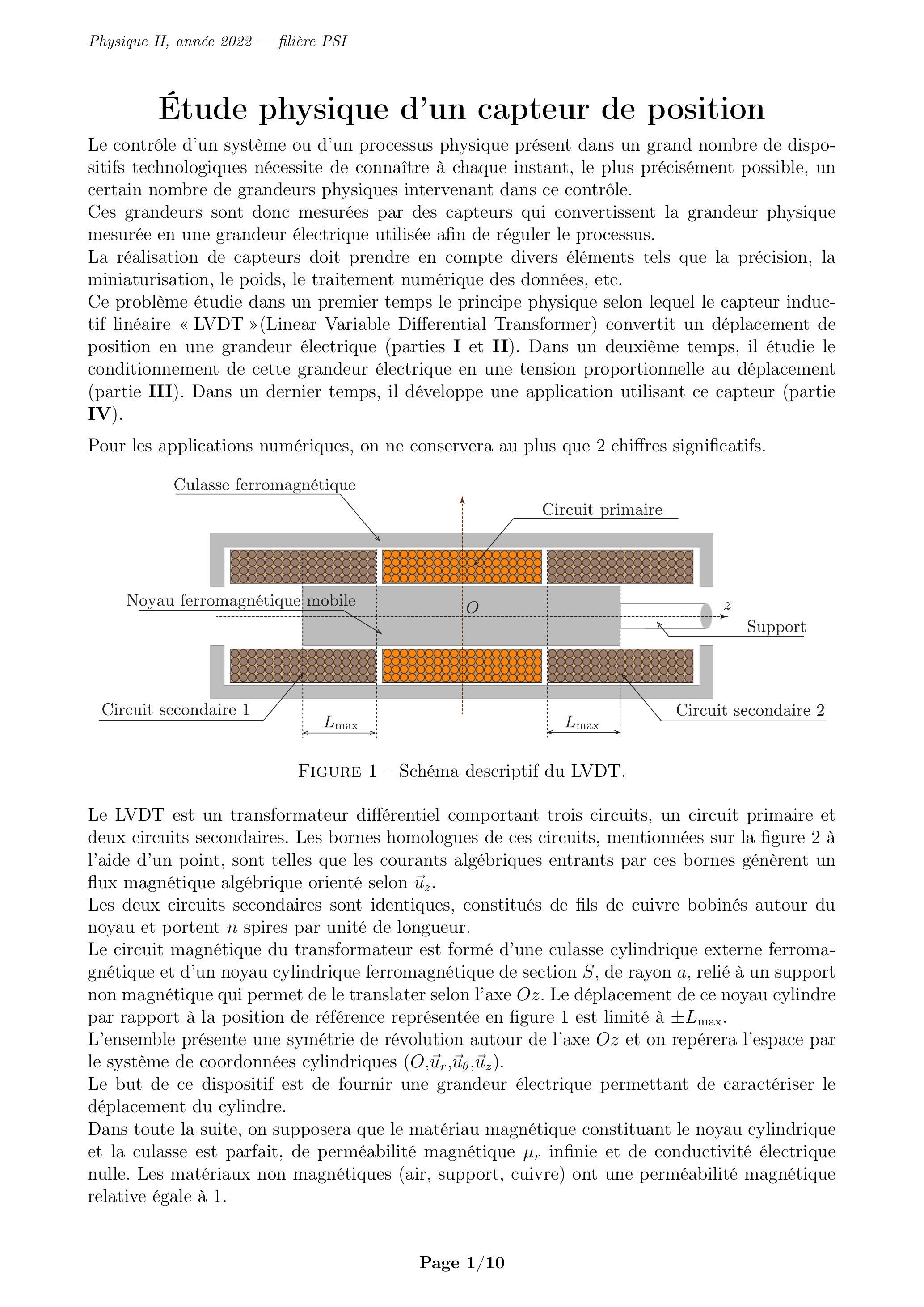 Ce problème étudie dans un premier temps le principe physique selon lequel le capteur inductif linéaire «LVDT» (Linear Variable Differential Transformer) convertit un déplacement de position en une grandeur électrique (parties I et II). Dans un deuxième temps, il étudie le conditionnement de cette grandeur électrique en une tension proportionnelle au déplacement (partie III). Dans un dernier temps, il développe une application utilisant ce capteur (partie IV).