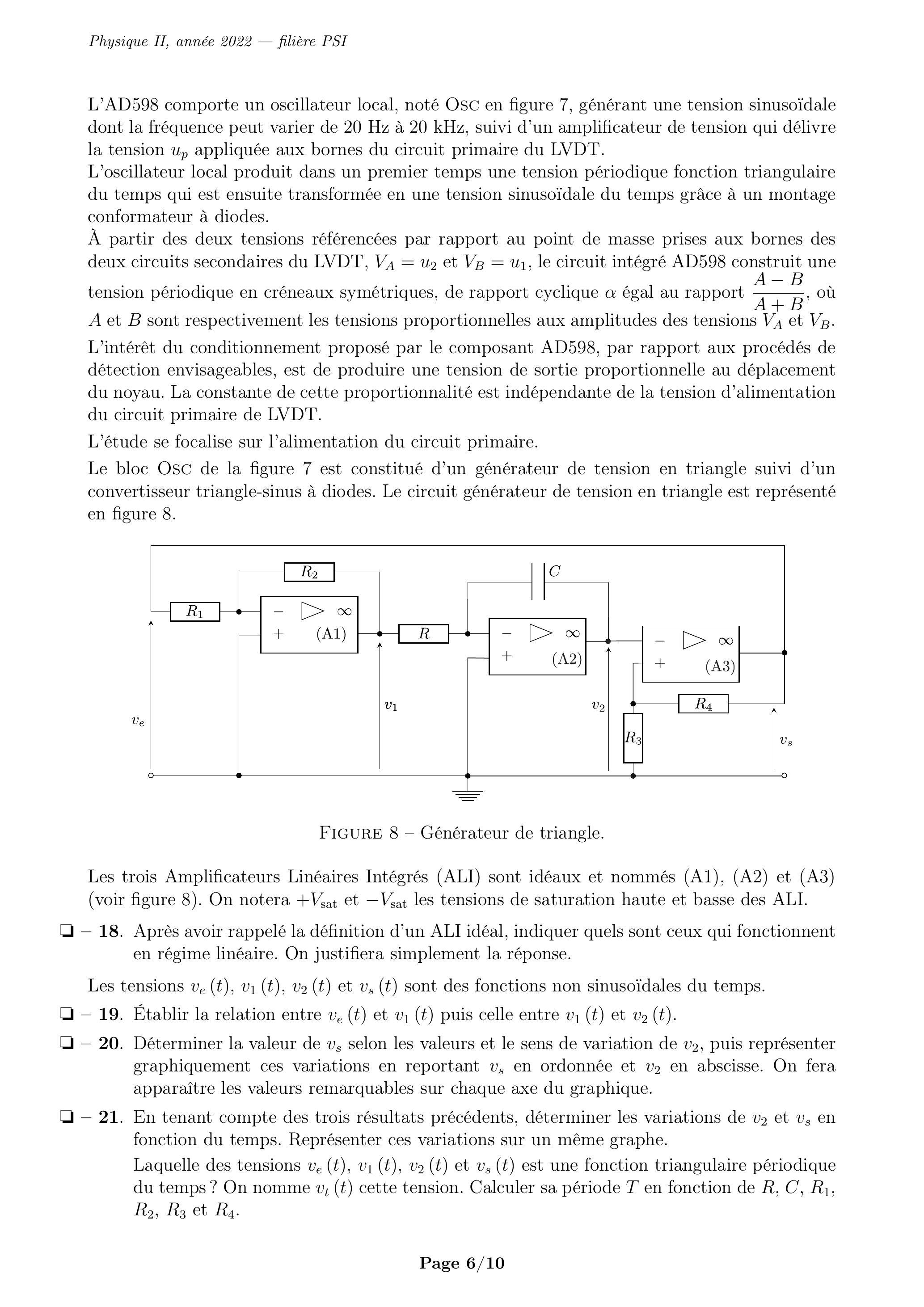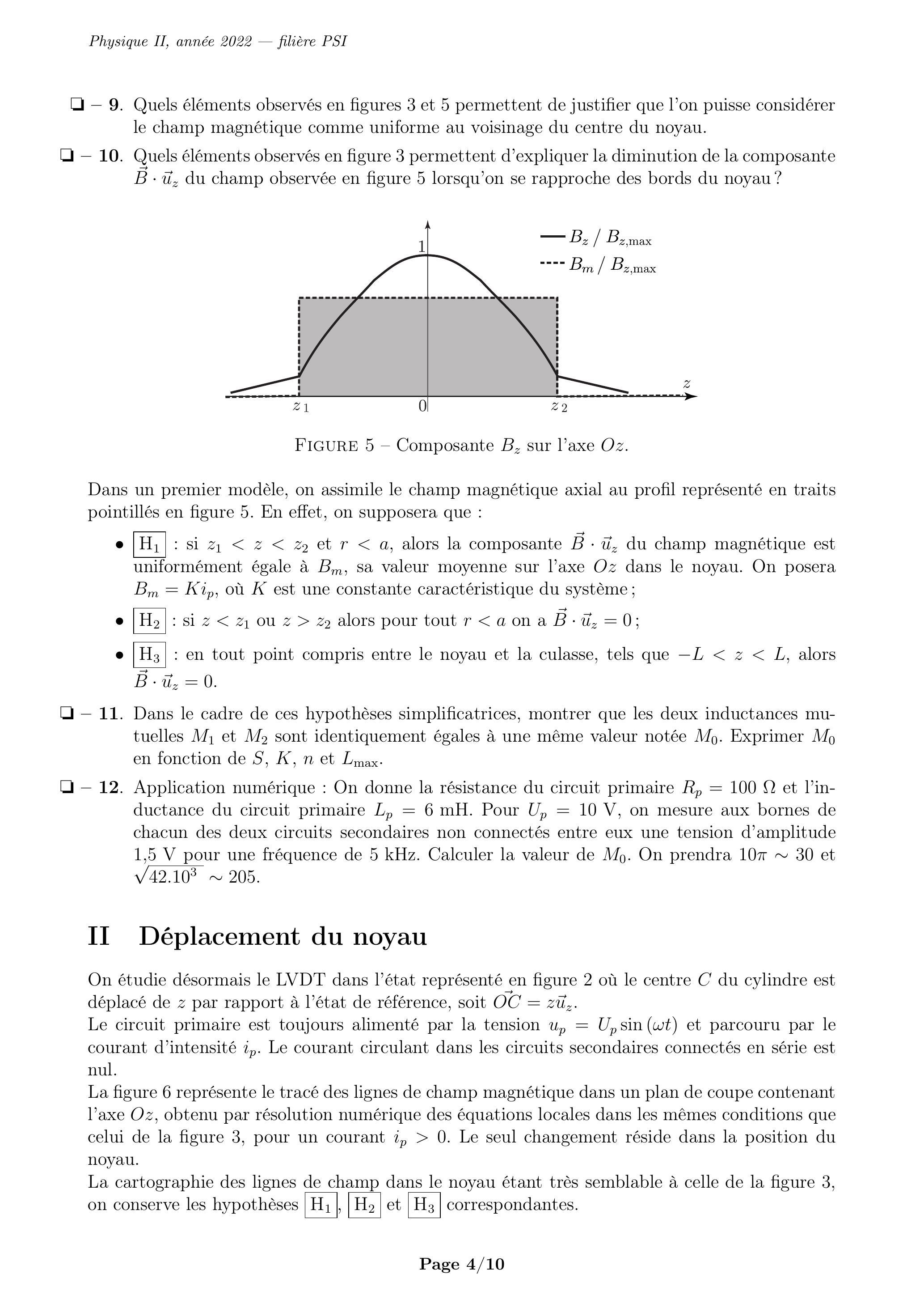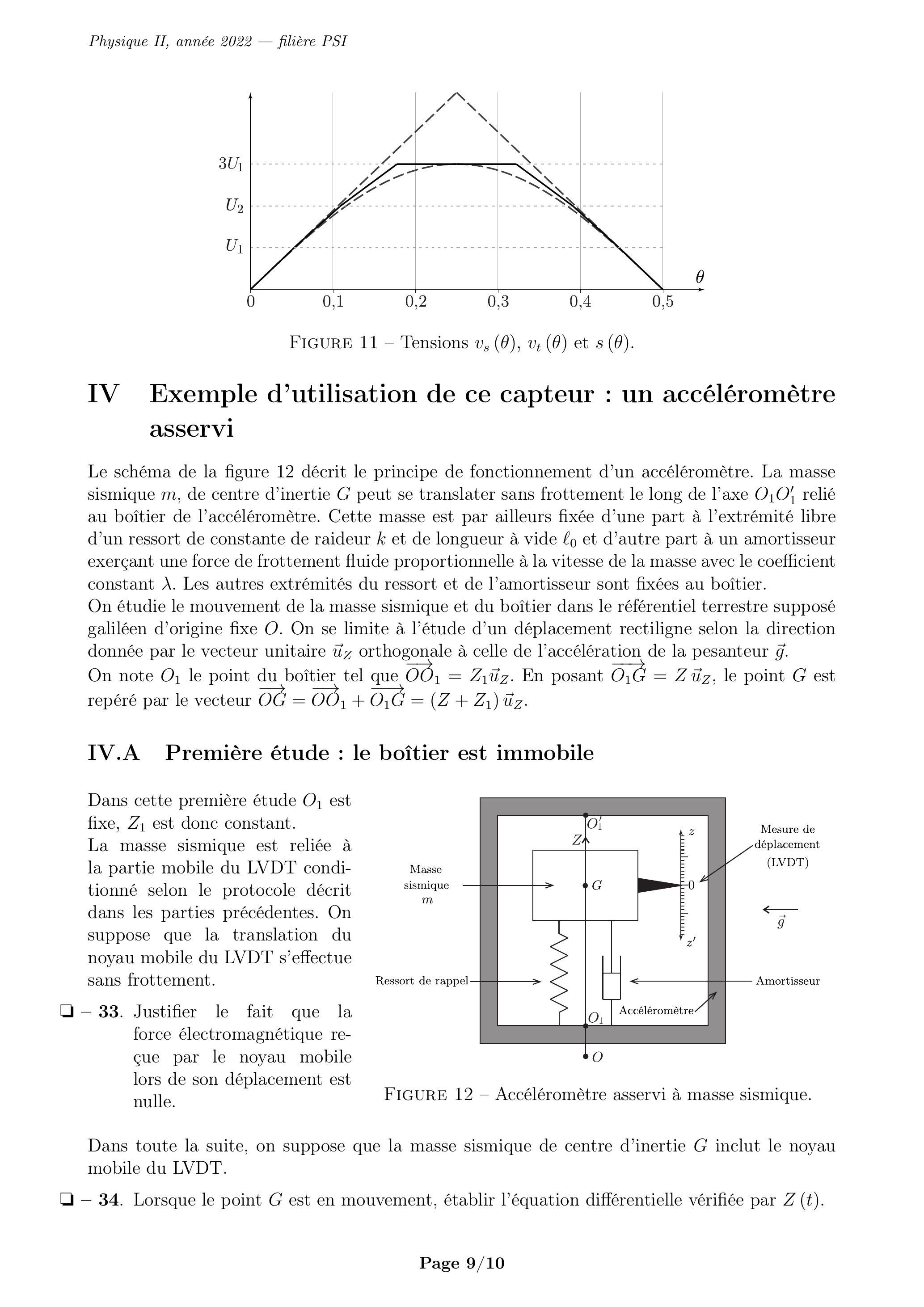 Ce problème étudie dans un premier temps le principe physique selon lequel le capteur inductif linéaire «LVDT» (Linear Variable Differential Transformer) convertit un déplacement de position en une grandeur électrique (parties I et II). Dans un deuxième temps, il étudie le conditionnement de cette grandeur électrique en une tension proportionnelle au déplacement (partie III). Dans un dernier temps, il développe une application utilisant ce capteur (partie IV).