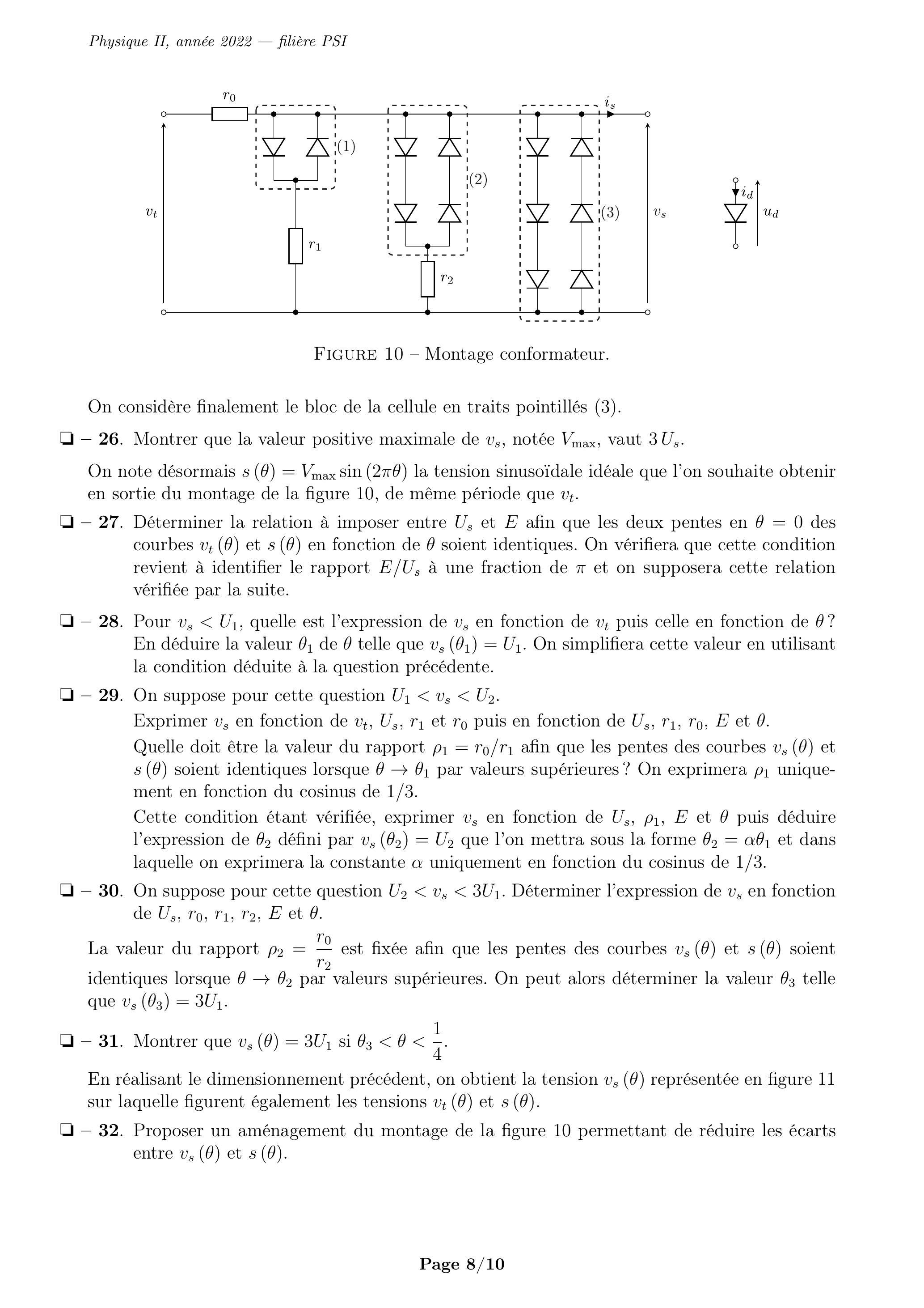 Le montage conformateur, alimenté par la tension , est dimensionné pour délivrer une tension se rapprochant au mieux de la tension représentée en figure 9 . Le dimensionnement consiste, entre autres, à choisir correctement les résistances et , lorsque . Ce choix sera effectué pour une valeur du courant de sortie . . Pour , donner l'expression de en fonction de et de .