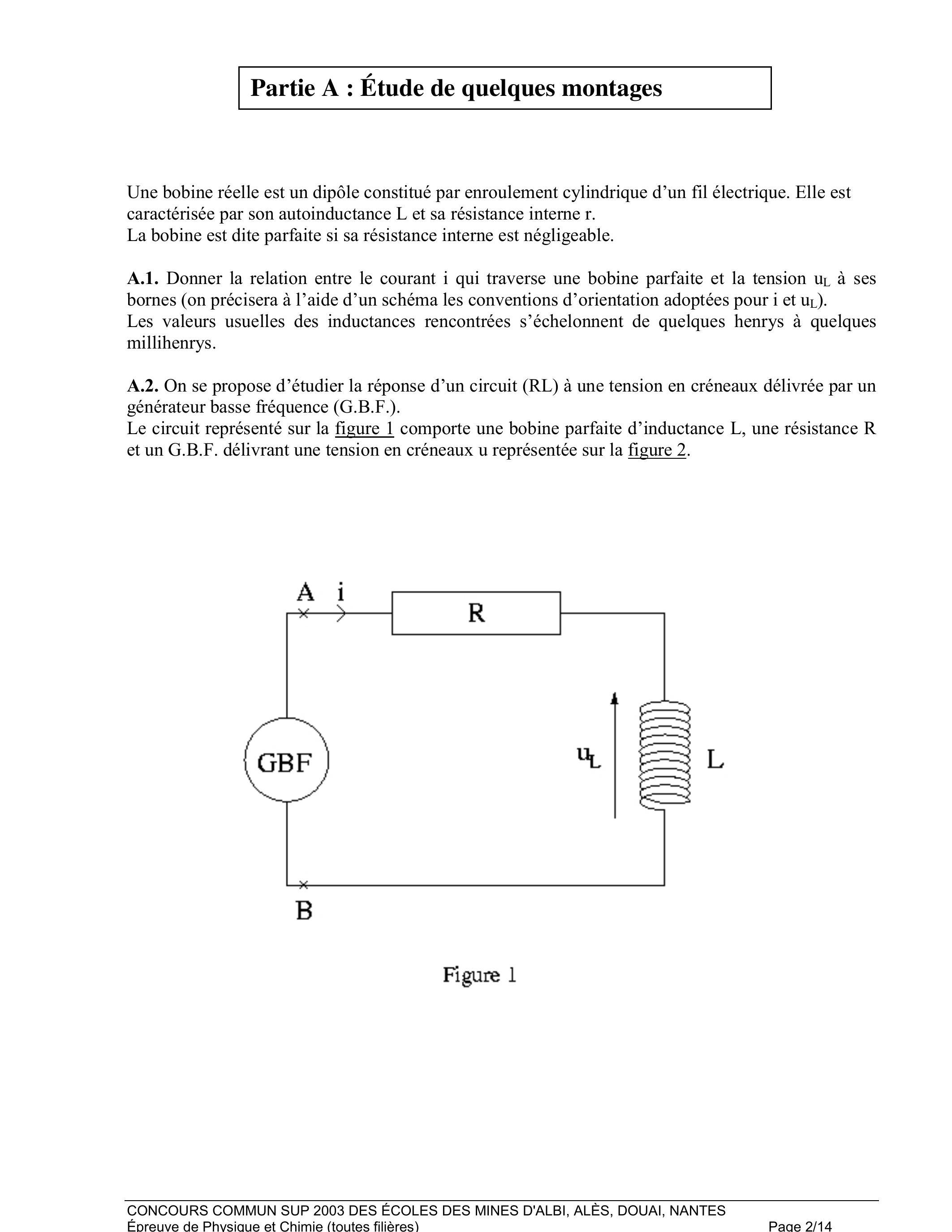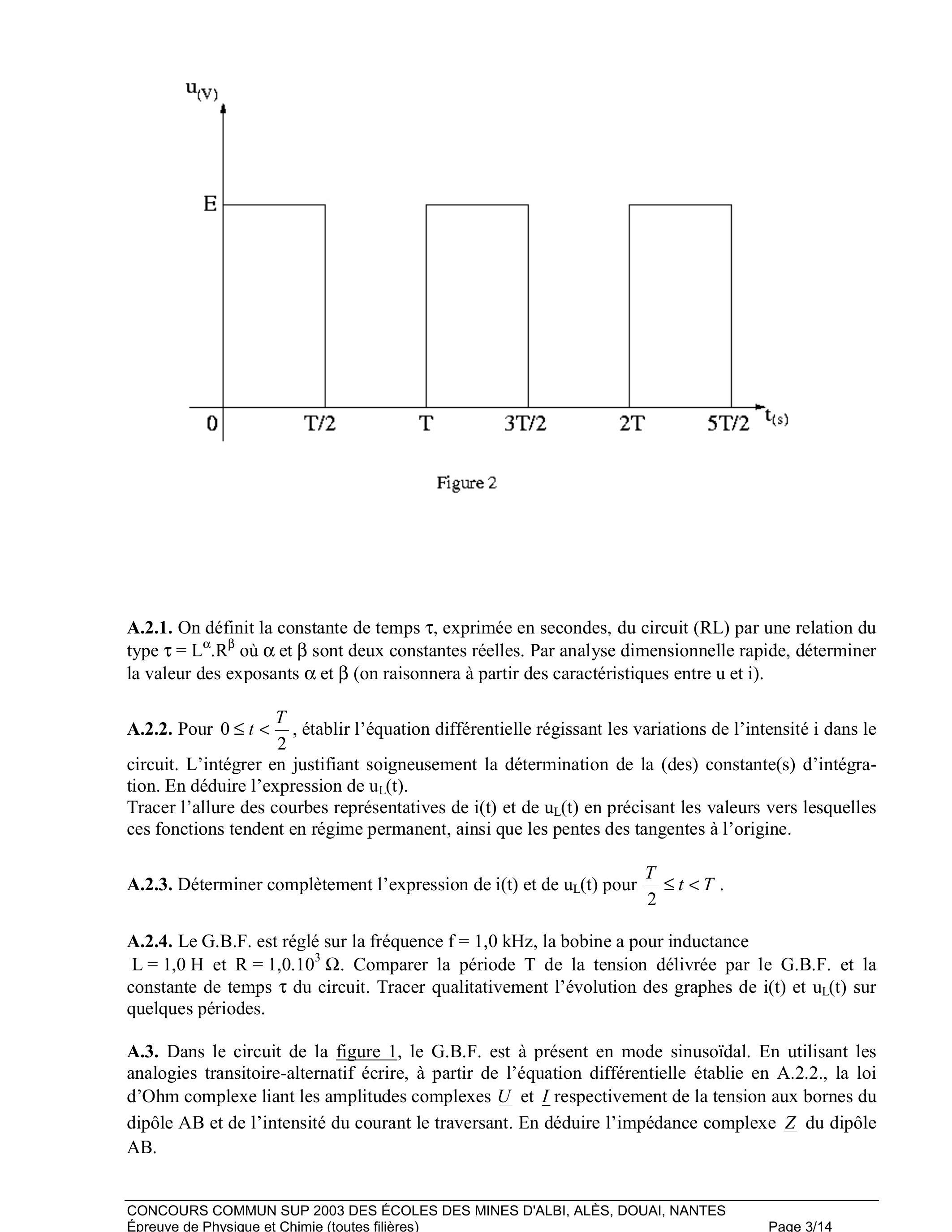 Le circuit représenté sur la figure 1 comporte une bobine parfaite d'inductance L , une résistance R et un G.B.F. délivrant une tension en créneaux u représentée sur la figure 2.