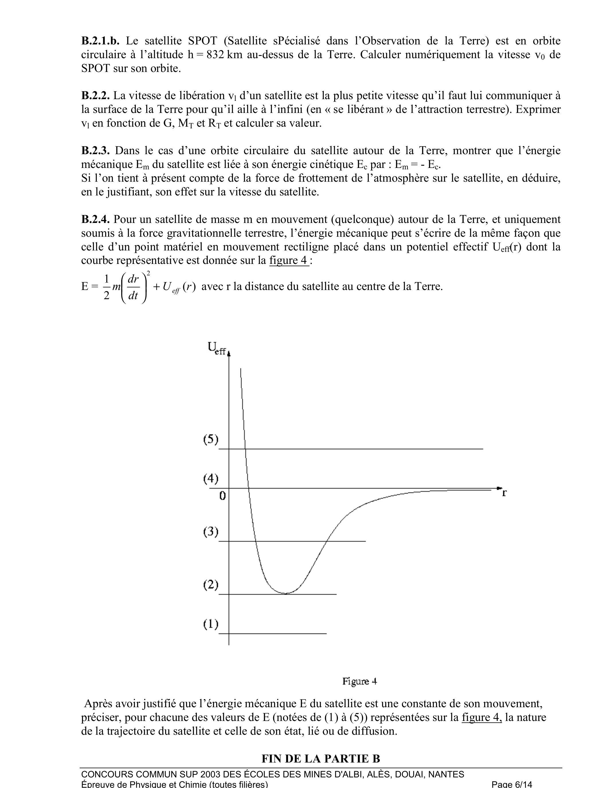 Après avoir justifié que l'énergie mécanique E du satellite est une constante de son mouvement, préciser, pour chacune des valeurs de E (notées de (1) à (5)) représentées sur la figure 4, la nature de la trajectoire du satellite et celle de son état, lié ou de diffusion.