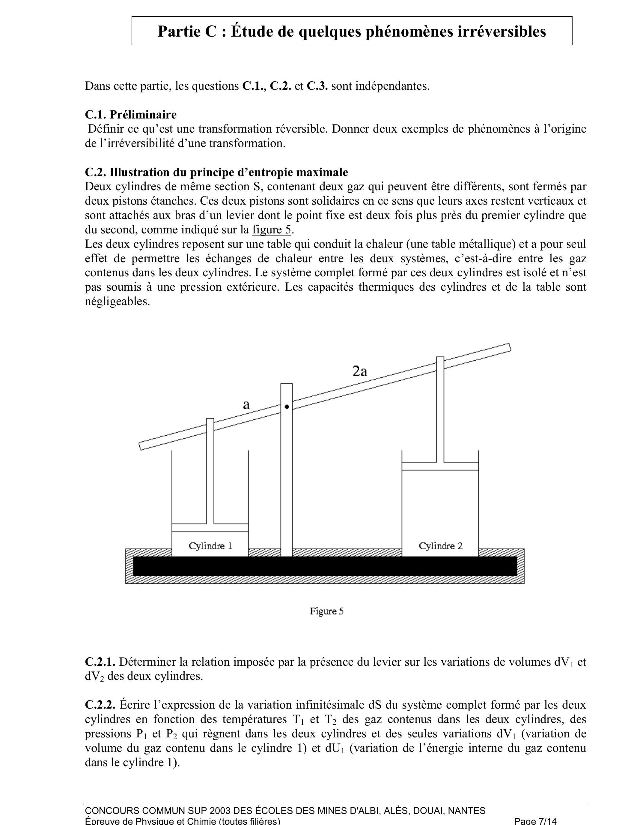 C.2.2. Écrire l'expression de la variation infinitésimale dS du système complet formé par les deux cylindres en fonction des températures et des gaz contenus dans les deux cylindres, des pressions et qui règnent dans les deux cylindres et des seules variations (variation de volume du gaz contenu dans le cylindre 1) et (variation de l'énergie interne du gaz contenu dans le cylindre 1).
