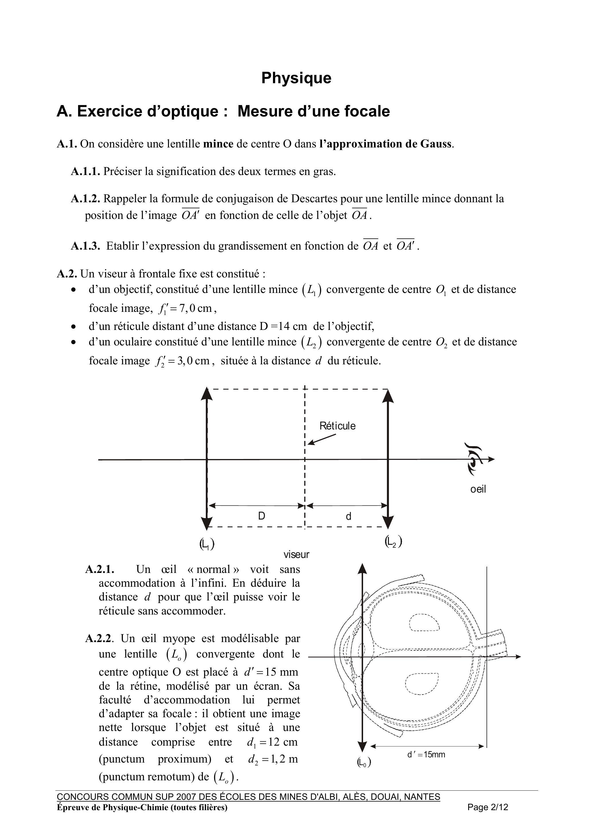 A.2.2. Un œil myope est modélisable par une lentille ( ) convergente dont le centre optique O est placé à de la rétine, modélisé par un écran. Sa faculté d'accommodation lui permet d'adapter sa focale : il obtient une image nette lorsque l'objet est situé à une distance comprise entre (punctum proximum) et