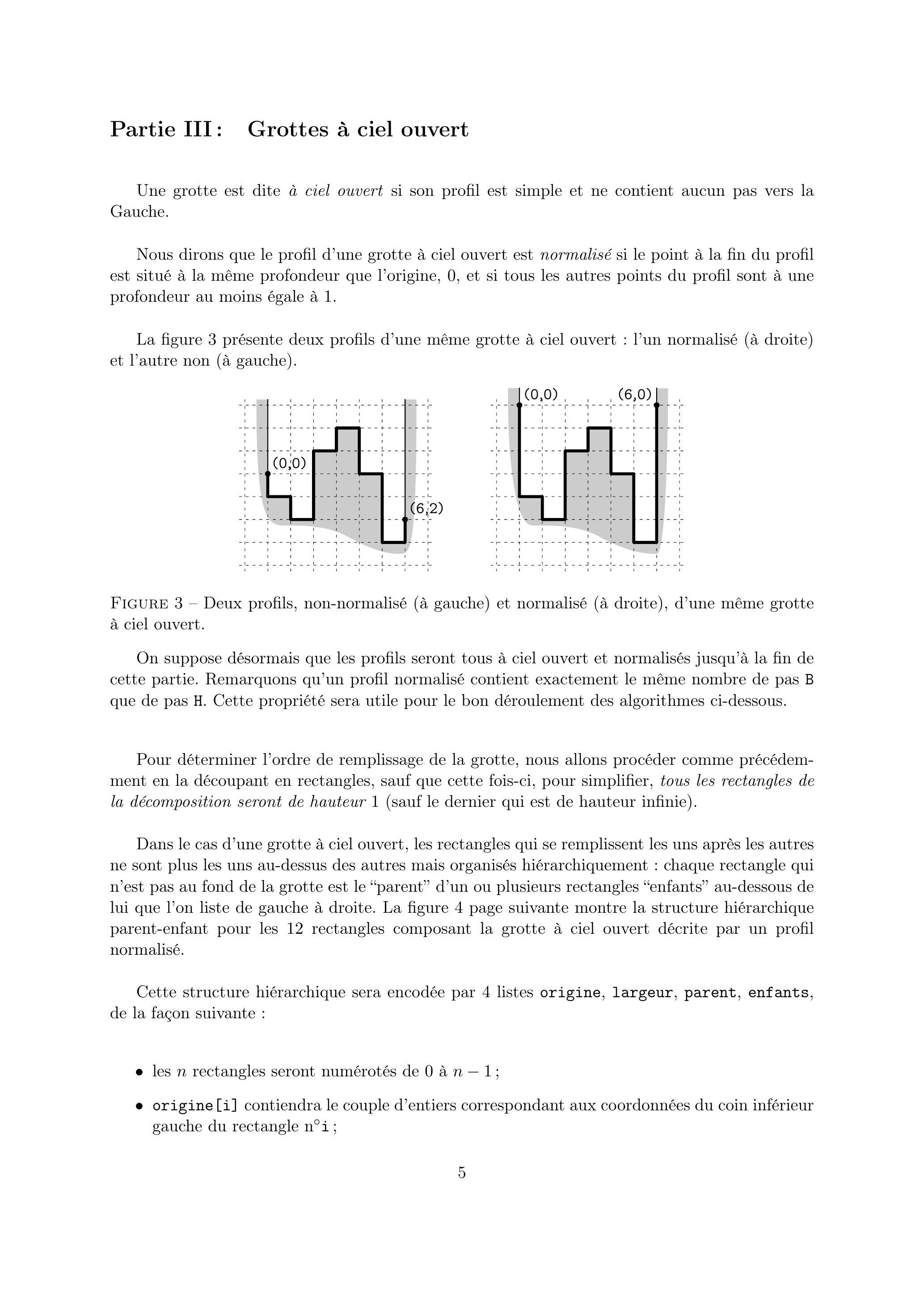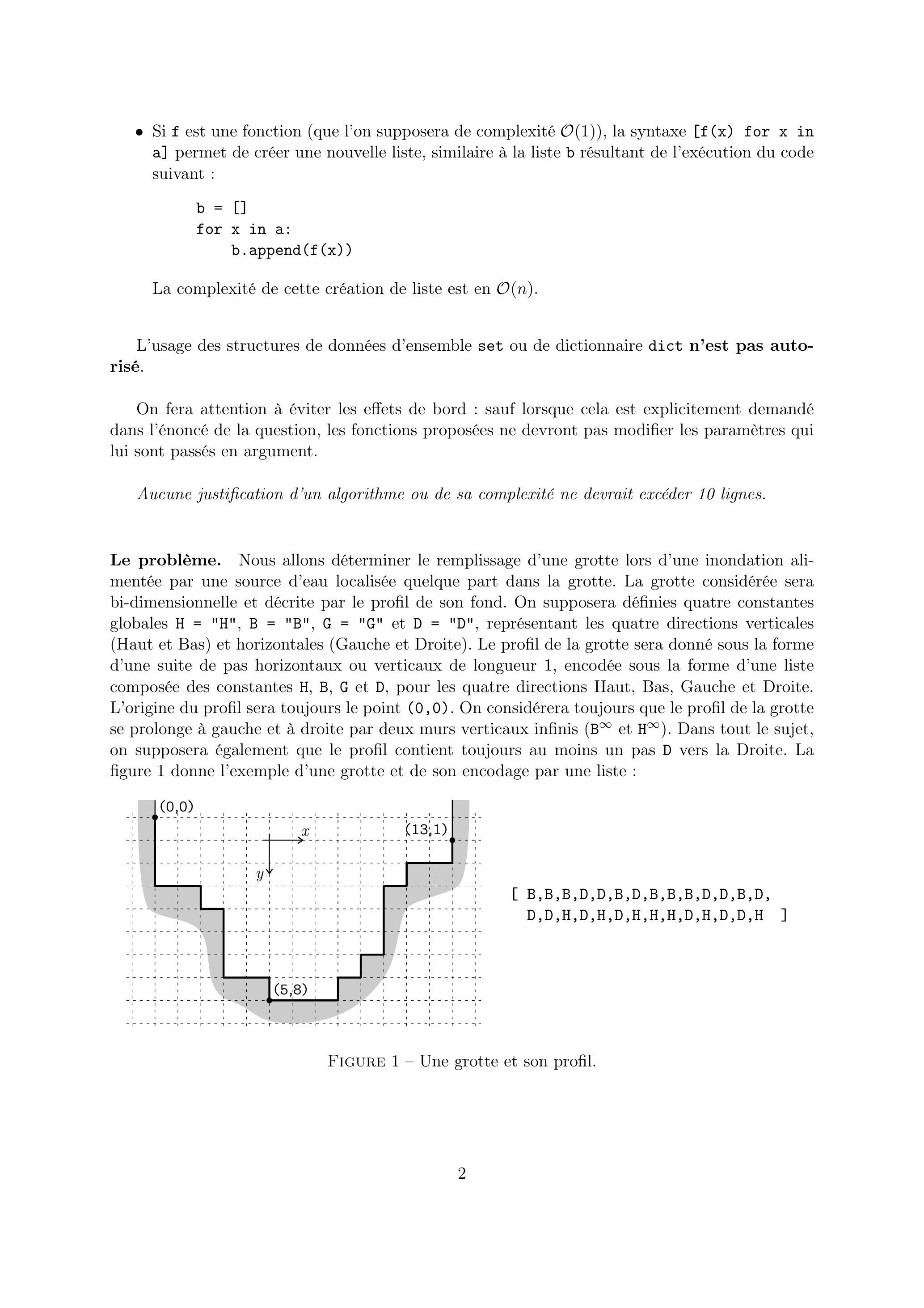 Le problème. Nous allons déterminer le remplissage d'une grotte lors d'une inondation alimentée par une source d'eau localisée quelque part dans la grotte. La grotte considérée sera bi-dimensionnelle et décrite par le profil de son fond. On supposera définies quatre constantes globales " ", " ", " " et " ", représentant les quatre directions verticales (Haut et Bas) et horizontales (Gauche et Droite). Le profil de la grotte sera donné sous la forme d'une suite de pas horizontaux ou verticaux de longueur 1, encodée sous la forme d'une liste composée des constantes H, B, G et D, pour les quatre directions Haut, Bas, Gauche et Droite. L'origine du profil sera toujours le point ( 0,0 ). On considérera toujours que le profil de la grotte se prolonge à gauche et à droite par deux murs verticaux infinis ( et ). Dans tout le sujet, on supposera également que le profil contient toujours au moins un pas D vers la Droite. La figure 1 donne l'exemple d'une grotte et de son encodage par une liste :