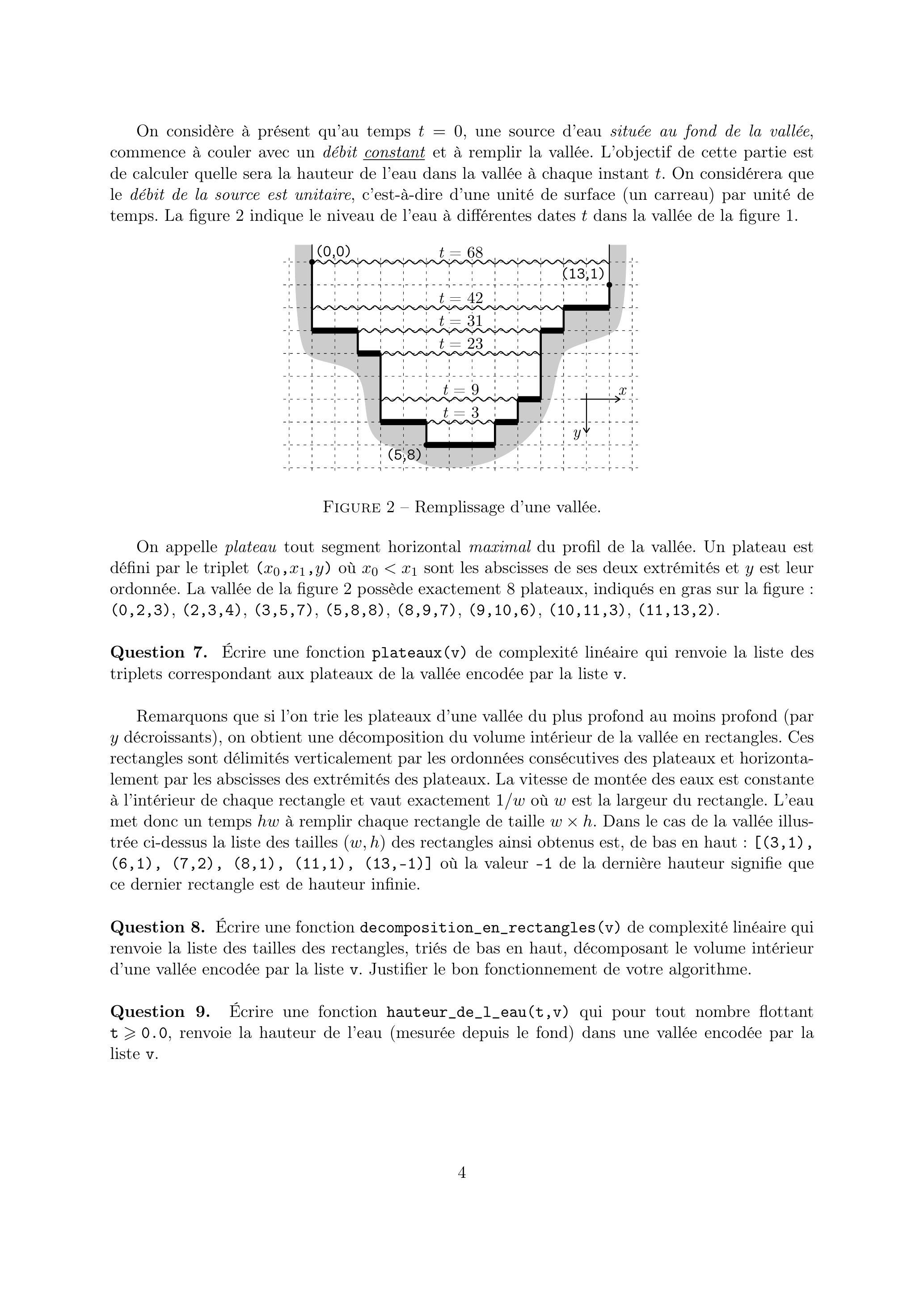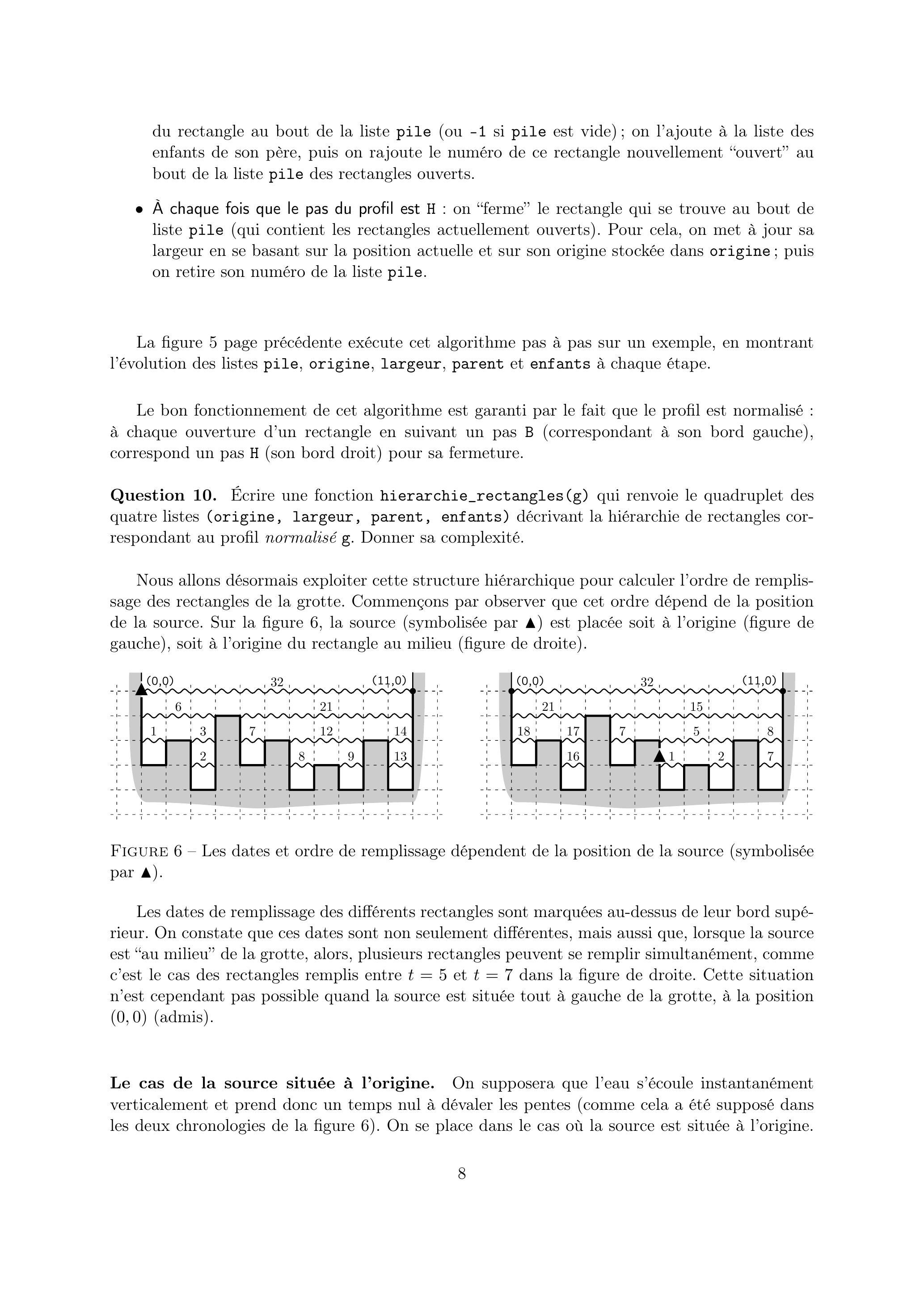Question 15. Décrire un algorithme qui prend en entrée le numéro source du rectangle à l'origine duquel est située la source, les trois listes largeur, parent et enfants décrivant la hiérarchie des rectangles, et qui renvoie une liste hauteur telle que hauteur[ ] est la hauteur d'eau présente dans le rectangle à l'instant t . On pourra utiliser les procédures définies cidessus. On ne demande pas l'écriture d'un programme mais la présentation argumentée d'une solution algorithmique à ce problème.