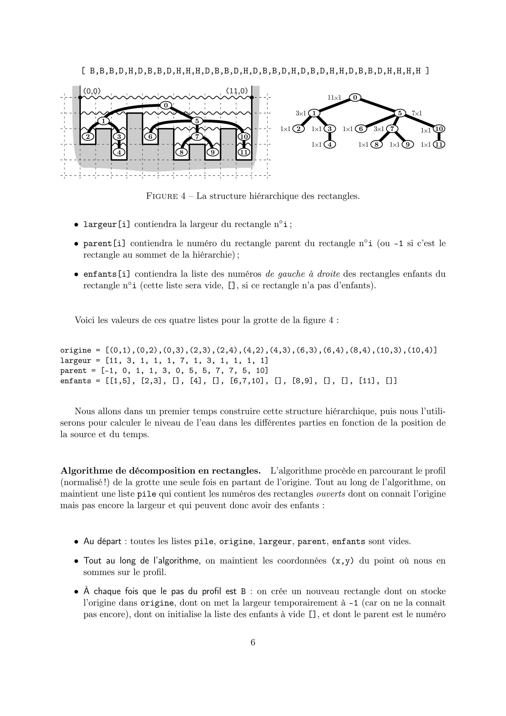 Question 12. Écrire une fonction hauteurs_eau_depuis_origine(t, largeur, parent, enfants) qui prend en entrée un flottant t , et les trois listes largeur, parent et enfants, décrivant la hiérarchie des rectangles d'une grotte à ciel ouvert, et renvoie une liste hauteur où hauteur [ ] est la hauteur d'eau dans le rectangle à l'instant t (la hauteur sera donc un flottant entre 0 et 1 sauf pour le dernier rectangle qui est infini et peut donc être rempli à une hauteur arbitrairement grande). Expliciter sa complexité.