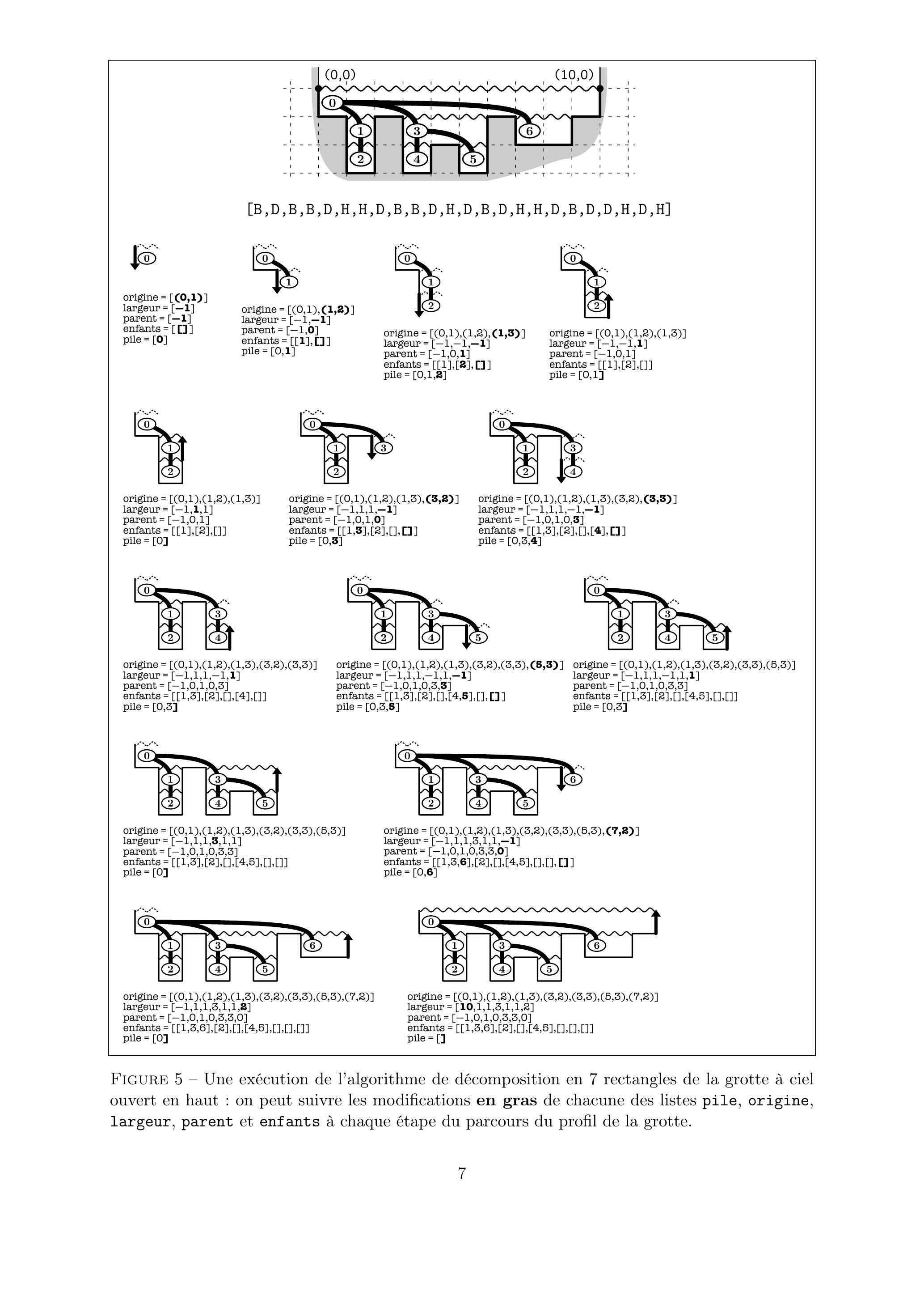 Figure 5 - Une exécution de l'algorithme de décomposition en 7 rectangles de la grotte à ciel ouvert en haut : on peut suivre les modifications en gras de chacune des listes pile, origine, largeur, parent et enfants à chaque étape du parcours du profil de la grotte.