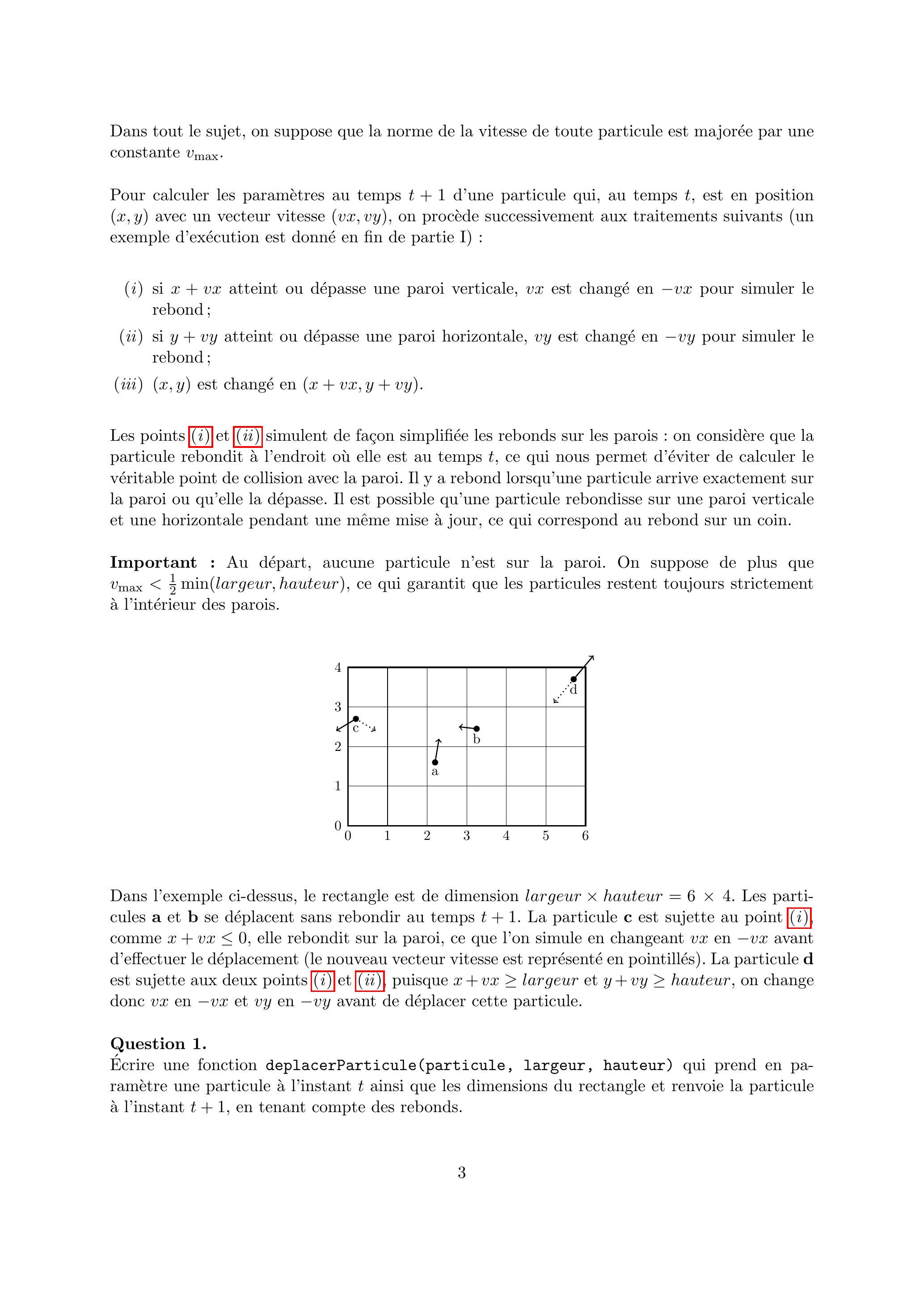 Ecrire une fonction deplacerParticule(particule, largeur, hauteur) qui prend en paramètre une particule à l'instant ainsi que les dimensions du rectangle et renvoie la particule à l'instant , en tenant compte des rebonds.