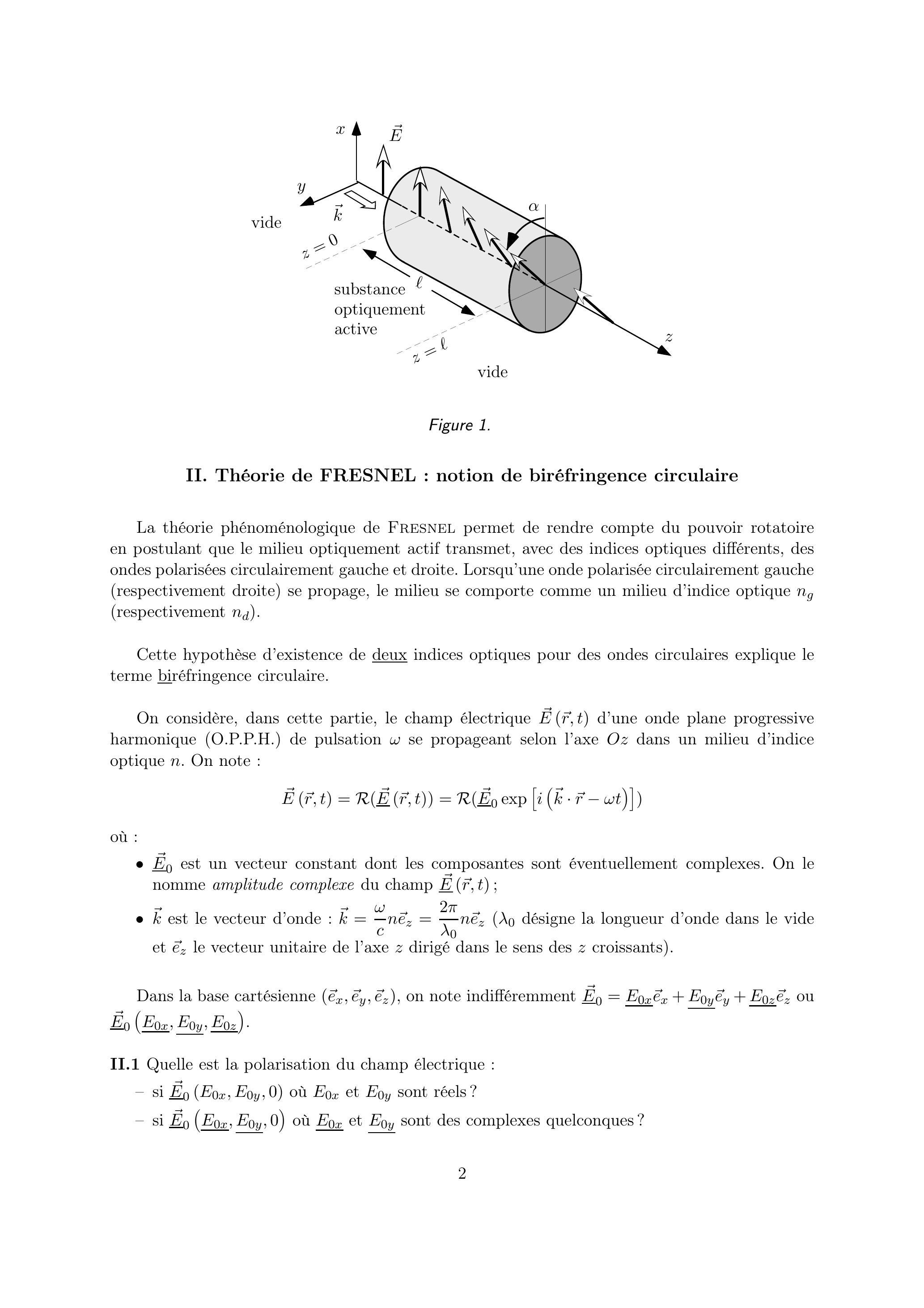Une lumière monochromatique polarisée rectilignement selon l'axe pénètre en dans une substance optiquement active. Elle émerge en avec une polarisation qui fait un angle avec l'axe (voir figure 1). L'algébrisation de l'angle est telle que ( ) .