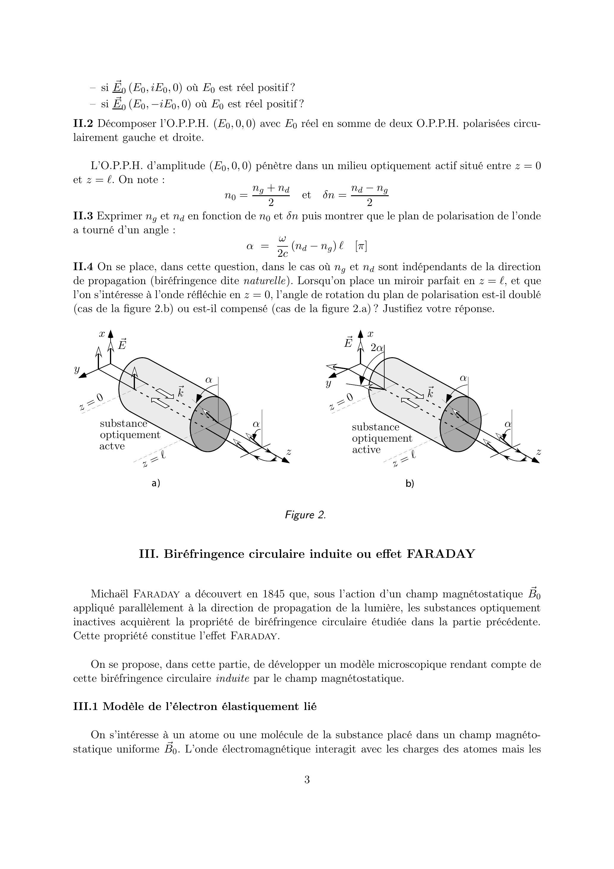 III.2.2 Lorsqu'on place un miroir parfait en , et que l'on s'intéresse à l'onde réfléchie en , on constate expérimentalement que l'angle de rotation du plan de polarisation est doublé (comme dans le cas de la figure 2.b). Le modèle microscopique précédent rend-il compte de cette observation?