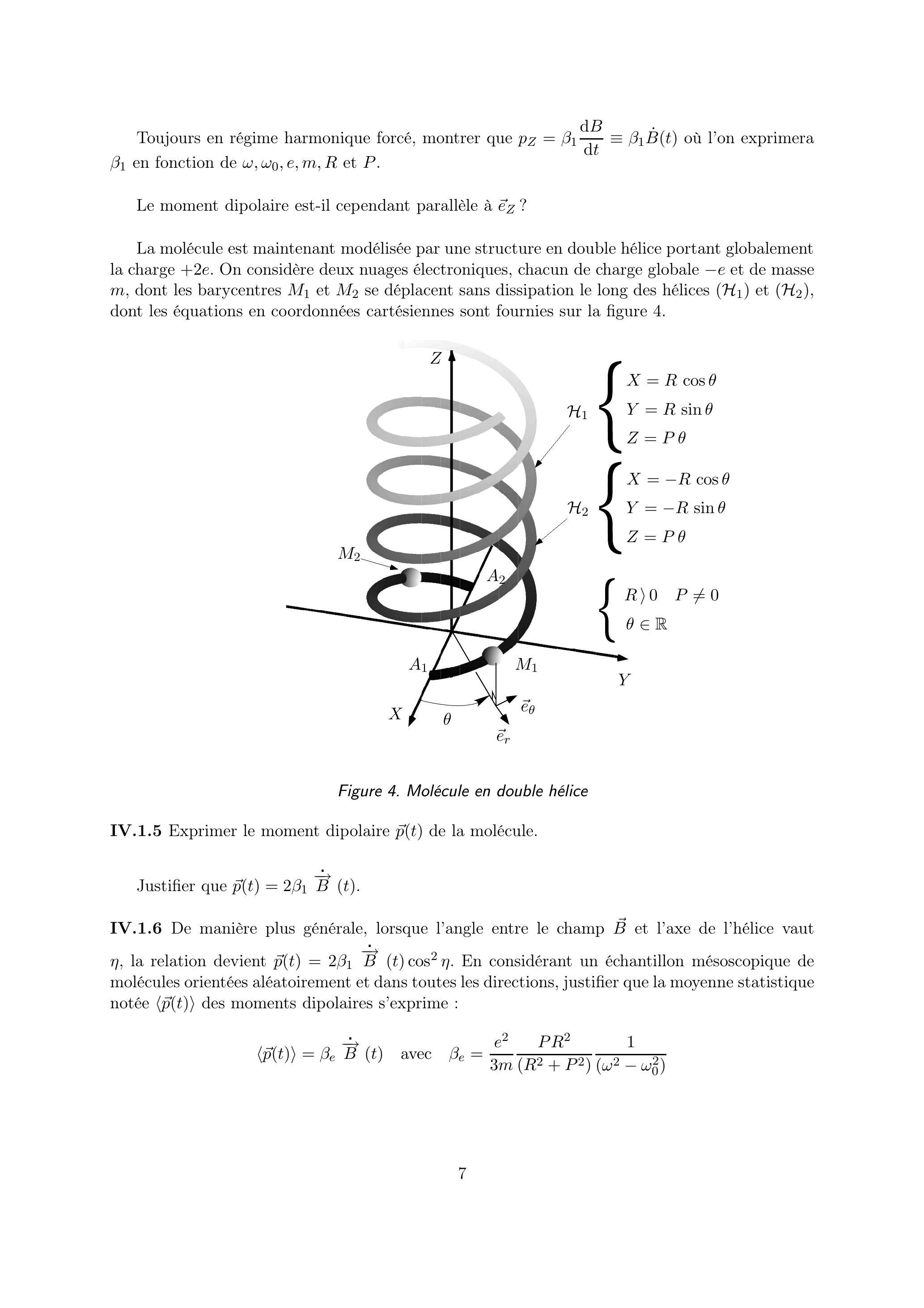 La molécule est maintenant modélisée par une structure en double hélice portant globalement la charge . On considère deux nuages électroniques, chacun de charge globale et de masse , dont les barycentres et se déplacent sans dissipation le long des hélices ( ) et ( ), dont les équations en coordonnées cartésiennes sont fournies sur la figure 4.