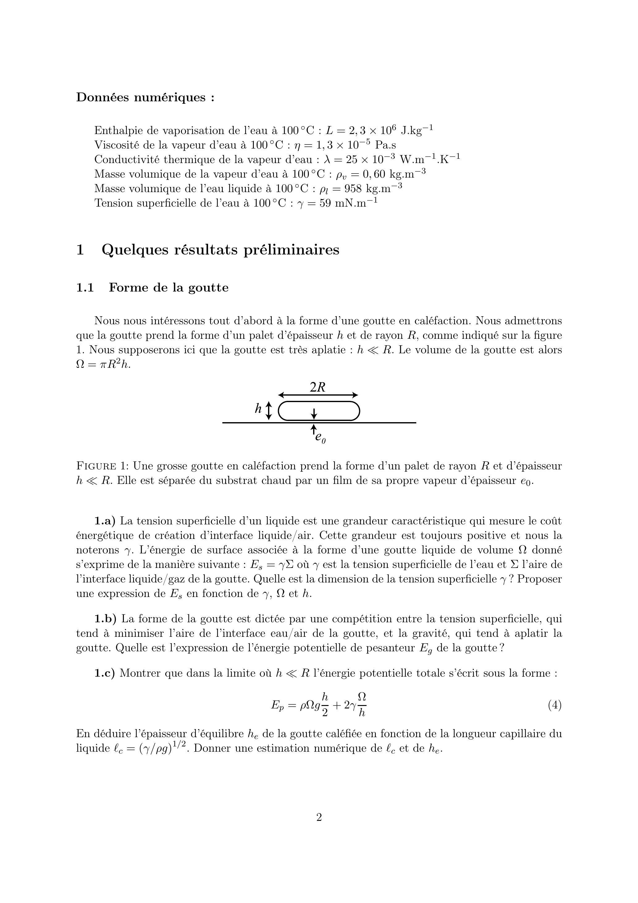 En déduire l'épaisseur d'équilibre de la goutte caléfiée en fonction de la longueur capillaire du liquide . Donner une estimation numérique de et de .
