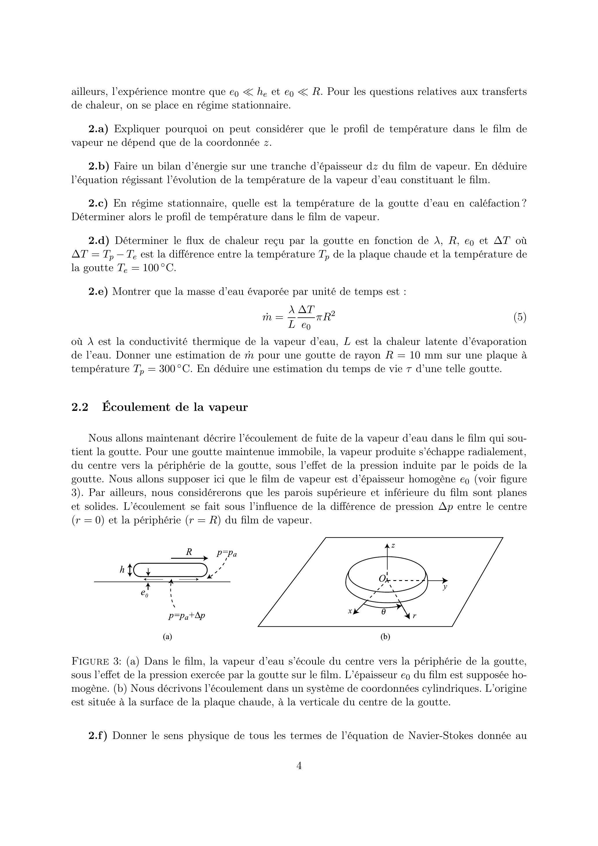 2.i) L'épaisseur du film de vapeur sous la goutte est typiquement . Le temps de vie d'une goutte centimétrique est de l'ordre de quelques minutes. En déduire un ordre de grandeur de la vitesse d'écoulement de la vapeur d'eau sous la goutte.