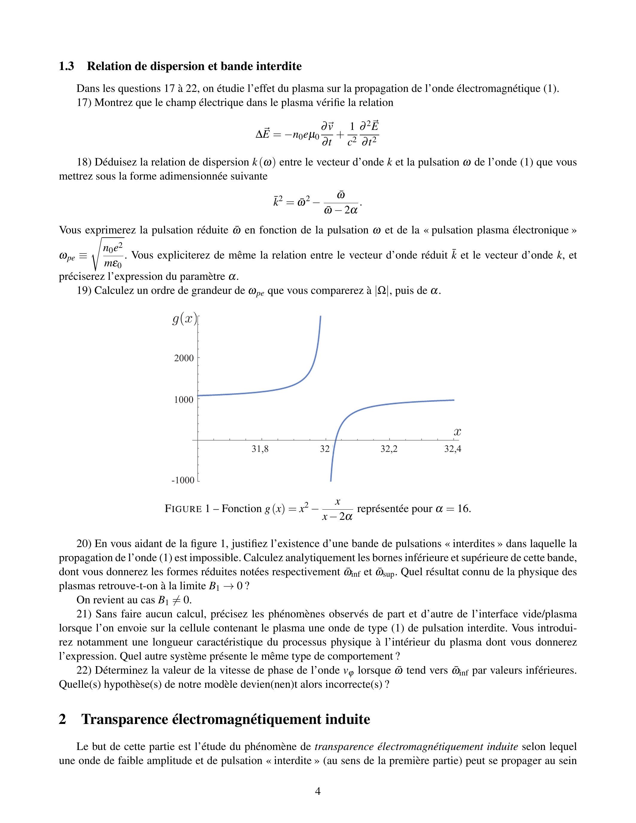 Vous exprimerez la pulsation réduite en fonction de la pulsation et de la «pulsation plasma électronique» . Vous expliciterez de même la relation entre le vecteur d'onde réduit et le vecteur d'onde , et préciserez l'expression du paramètre .