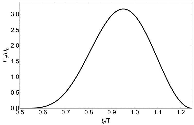 - Lorsque l'électron revient au point de départ, il peut se recombiner avec le noyau. Ce modèle est connu sous le nom de "modèle en trois étapes" : l'électron est arraché de l'atome, puis fait une excursion dans le champ du laser, puis se recombine avec l'atome. L'énergie libérée dans la recombinaison est la somme de l'énergie d'ionisation,