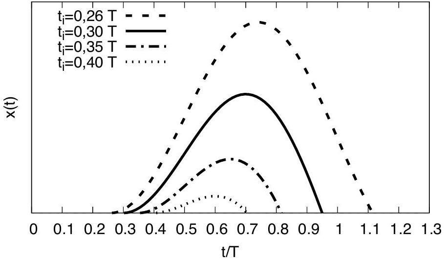 pour quatre autres valeurs de . On remarque que pour ces valeurs, l'électron revient en à un temps de retour qu'on notera . Écrire l'équation reliant à , sans chercher à la résoudre.
