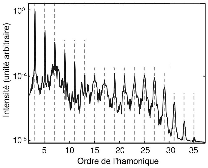 première partie. Ces harmoniques se propagent dans la même direction que celle de l'onde émise par le laser pompe, un filtre en aluminium ne laissant passer que celles de rang