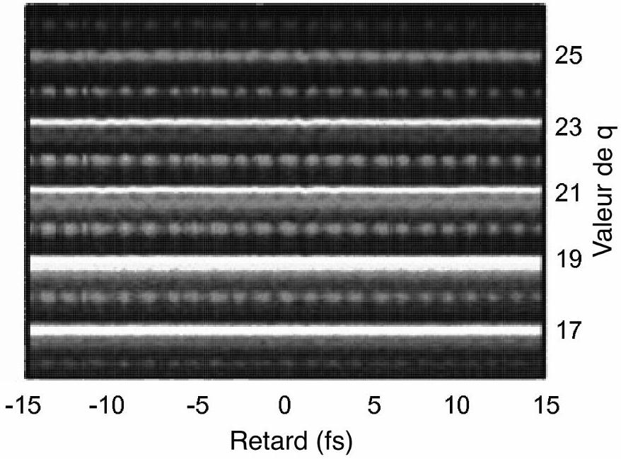 La figure 3 montre que le spectre de la lumière émise par l'argon contient un grand nombre de pics d'intensité comparables, associés aux harmoniques du laser incident. Nous allons montrer qu'une telle superposition d'harmoniques peut engendrer une impulsion très brève, puis décrire la méthode expérimentale qui permet de mesurer sa durée.
