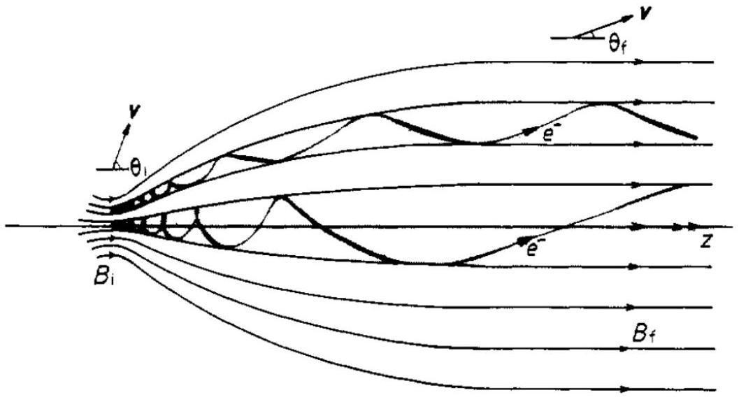 - Lorsque le champ vu par l'électron varie lentement le long de sa trajectoire, son mouvement dans le plan perpendiculaire reste approximativement circulaire, mais avec un rayon qui varie peu à peu. On admet que la variation de ce rayon est telle que le moment cinétique