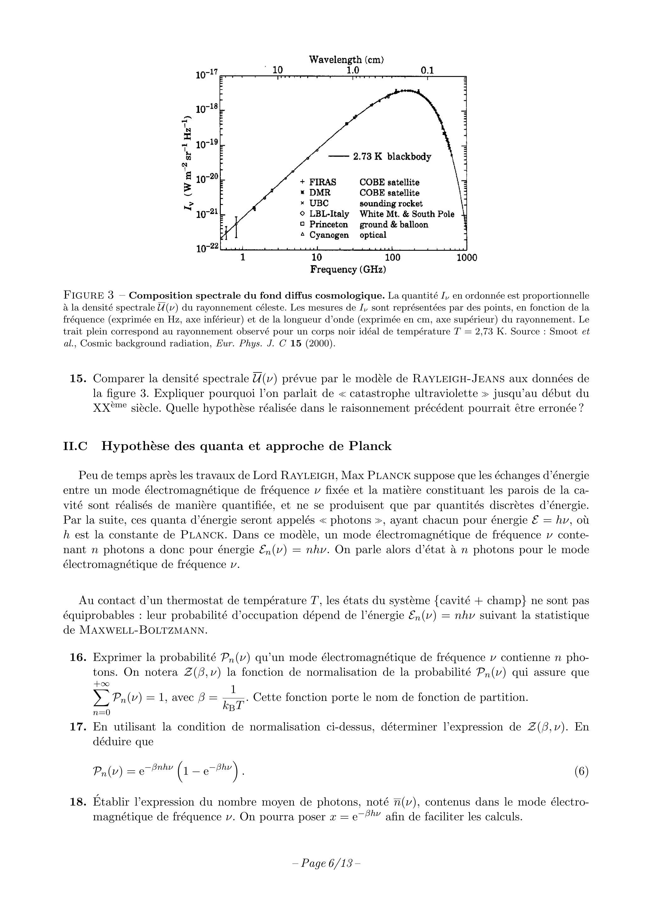 La figure 3 présente des données expérimentales sur la composition spectrale du fond diffus cosmologique . Découvert en 1965, ce rayonnement en provenance de l'espace interstellaire est très proche de celui du corps noir idéal, et présente un maximum d'émission dans le domaine micro-onde.
