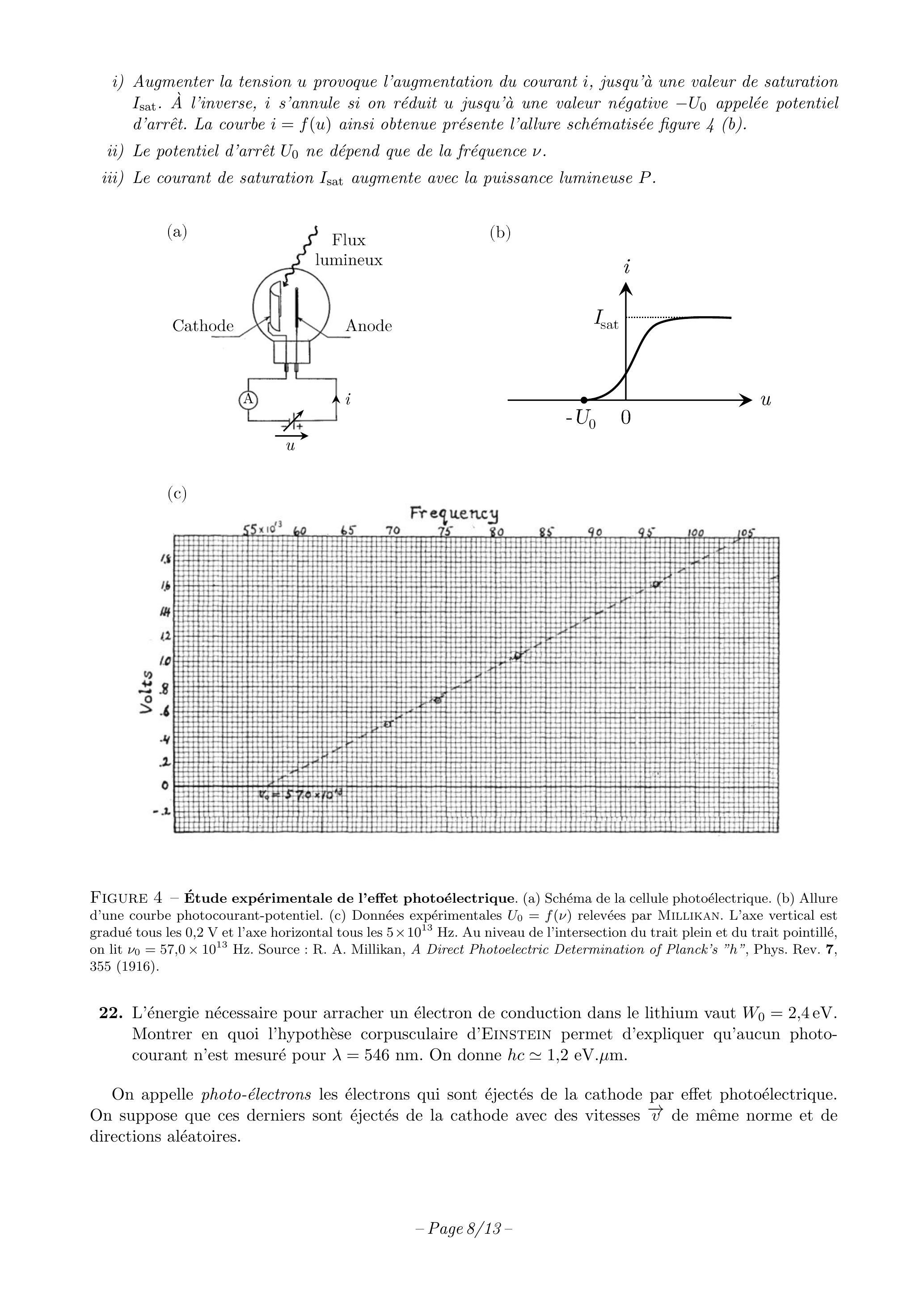 Afin de tester la théorie d'Einstein, Robert Andrews Millikan réalise en 1914 une expérience d'effet photoélectrique, qui s'avérera concluante et permettra même de déterminer la valeur de la constante . Le principe de l'expérience est le suivant : au sein d'une chambre à vide, il place une cathode métallique en lithium reliée à une anode au moyen d'un générateur de tension continue , et d'un ampère-mètre mesurant le courant dans le circuit, figure 4 (a). Un faisceau monochromatique issu d'une lampe à vapeur de mercure éclaire la cathode, sa longueur d'onde pouvant être réglée sur l'une des raies spectrales émises par la vapeur : et 546 nm . La puissance lumineuse du faisceau est également réglable.