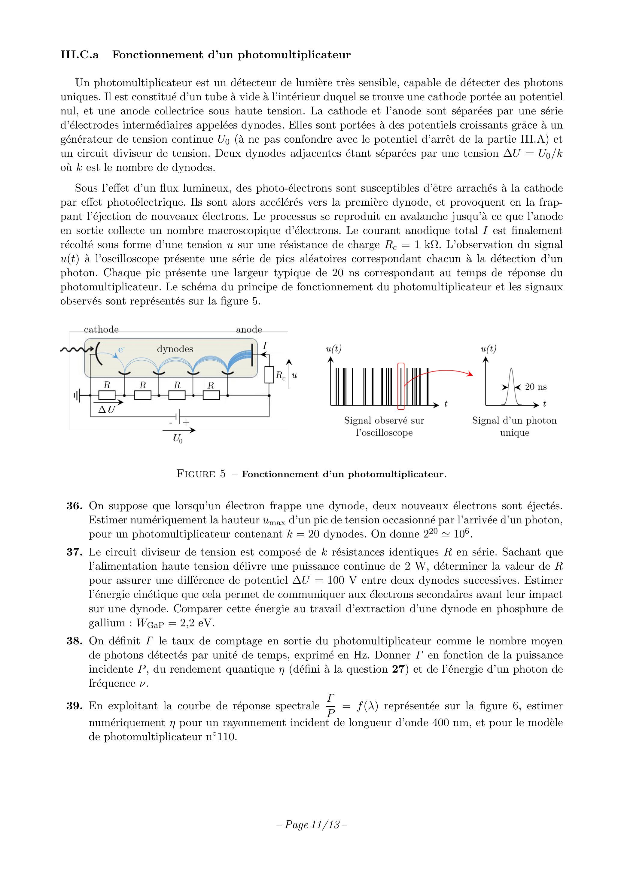 On définit le taux de comptage en sortie du photomultiplicateur comme le nombre moyen de photons détectés par unité de temps, exprimé en Hz. Donner en fonction de la puissance incidente , du rendement quantique (défini à la question ) et de l'énergie d'un photon de fréquence .