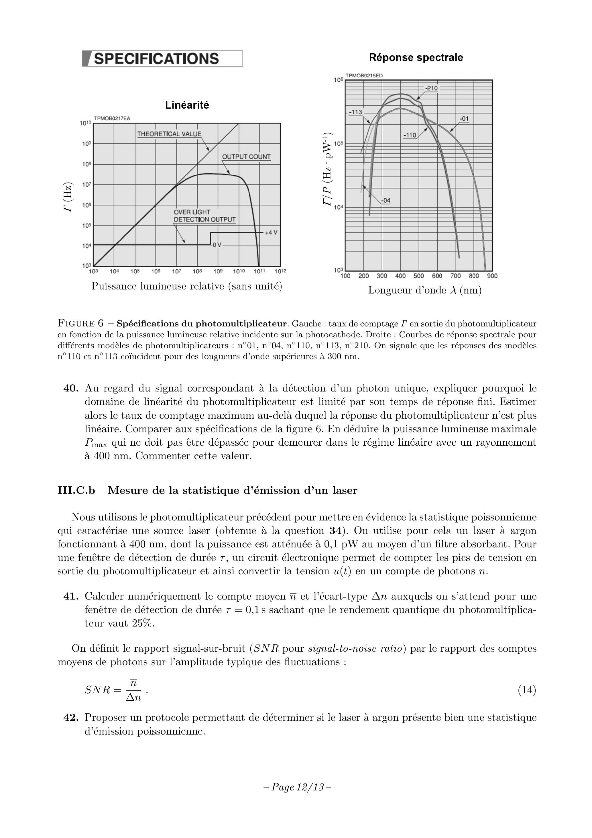 40. Au regard du signal correspondant à la détection d'un photon unique, expliquer pourquoi le domaine de linéarité du photomultiplicateur est limité par son temps de réponse fini. Estimer alors le taux de comptage maximum au-delà duquel la réponse du photomultiplicateur n'est plus linéaire. Comparer aux spécifications de la figure 6. En déduire la puissance lumineuse maximale qui ne doit pas être dépassée pour demeurer dans le régime linéaire avec un rayonnement à 400 nm . Commenter cette valeur.