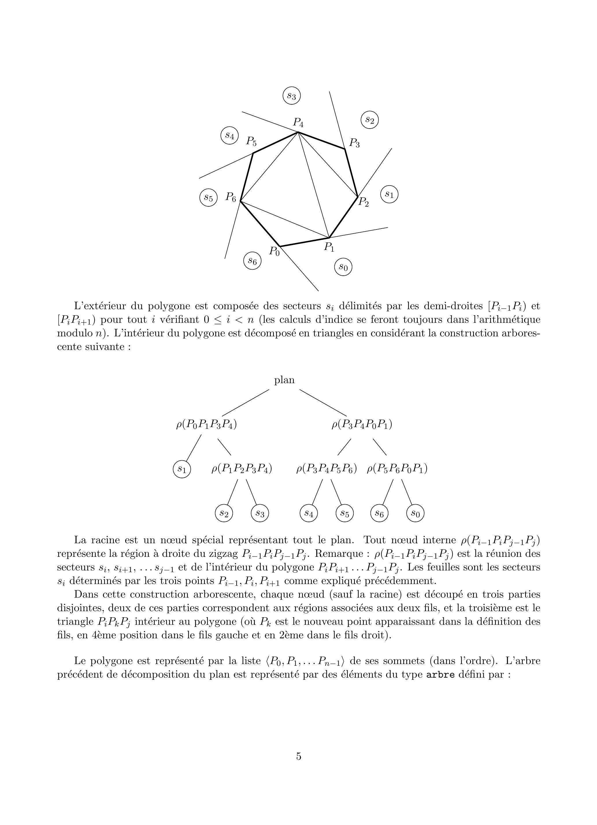 Le polygone est représenté par la liste de ses sommets (dans l'ordre). L'arbre précédent de décomposition du plan est représenté par des éléments du type arbre défini par :