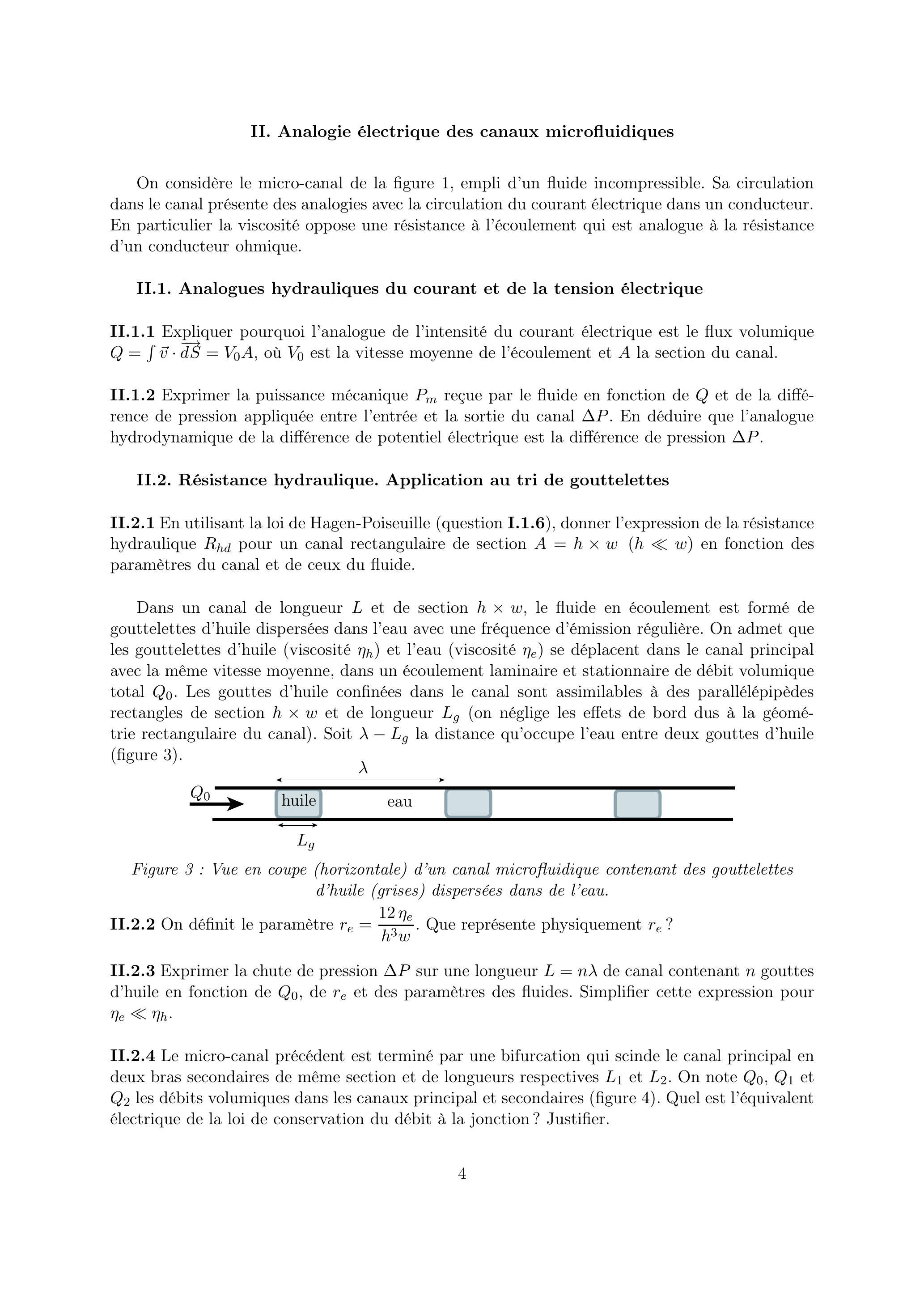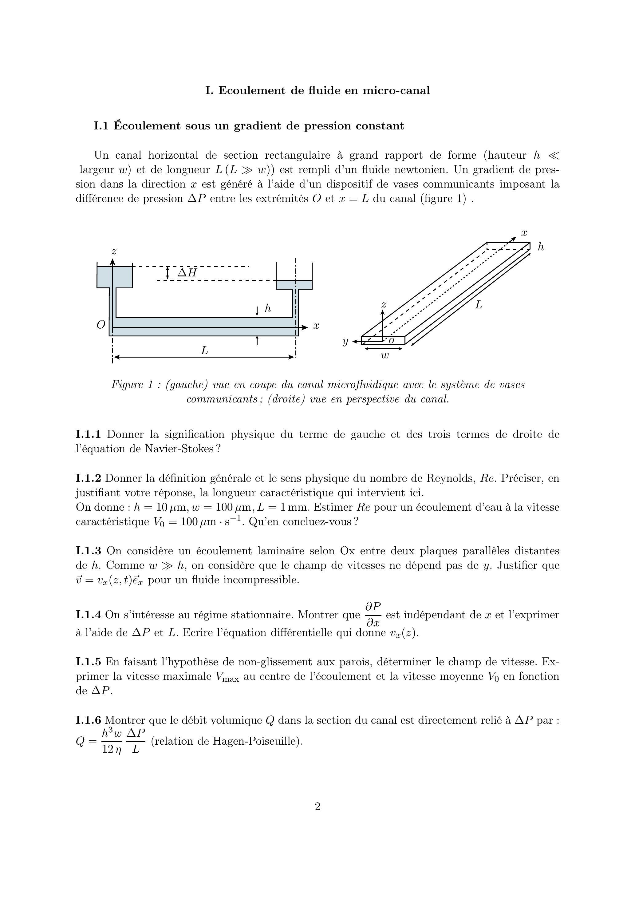 Le but de ce problème est d'étudier quelques aspects de ces phénomènes. Dans la partie I, nous nous intéresserons à l'hydrodynamique de l'écoulement d'un ou de plusieurs liquides dans des micro-canaux. La partie II visera à mettre en évidence une analogie électrique des canaux ou réseaux de micro-canaux et envisagera deux applications pratiques. Dans la partie III, nous étudierons l'influence de l'écoulement de liquide en micro-canal sur la diffusion d'espèces moléculaires.