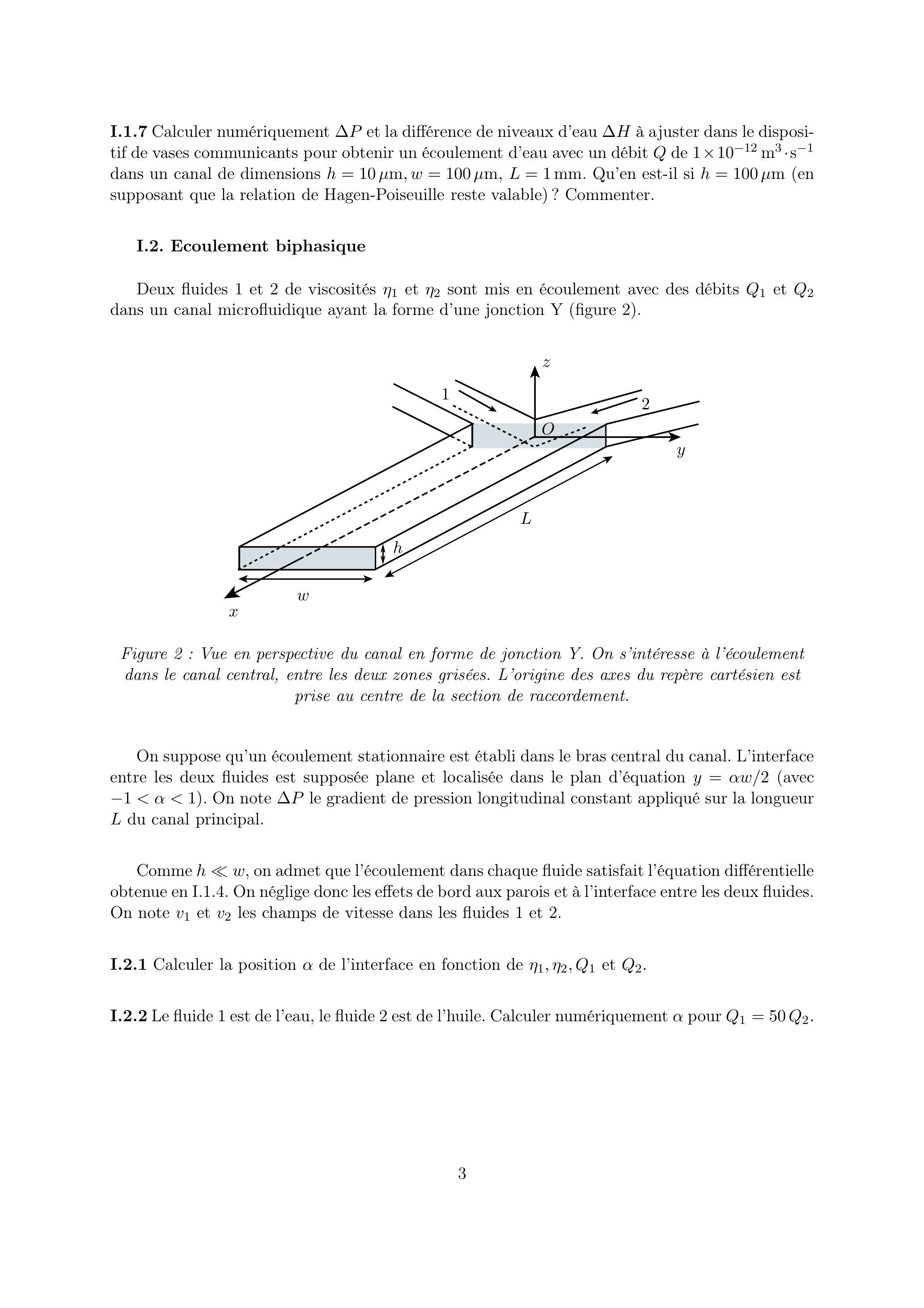 Deux fluides 1 et 2 de viscosités et sont mis en écoulement avec des débits et dans un canal microfluidique ayant la forme d'une jonction Y (figure 2).