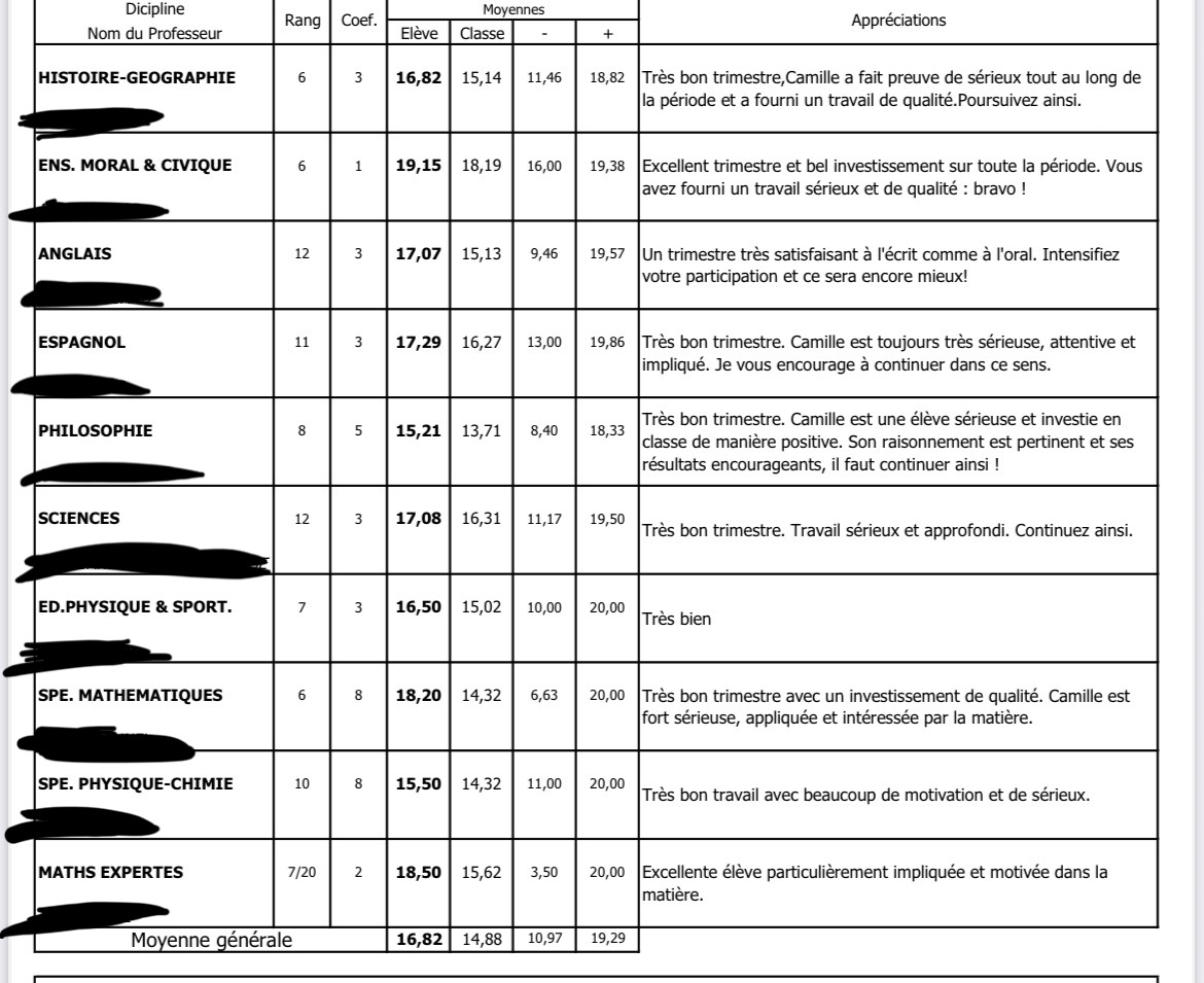 Je suis dans les Pyrénées Orientales, je suis en lycée privée bien classé avec des très bons élèves et un DS de 2 ou 4 heures toutes les semaines, je vous met en pièce jointe mon bulletin du premier trimestre de terminal