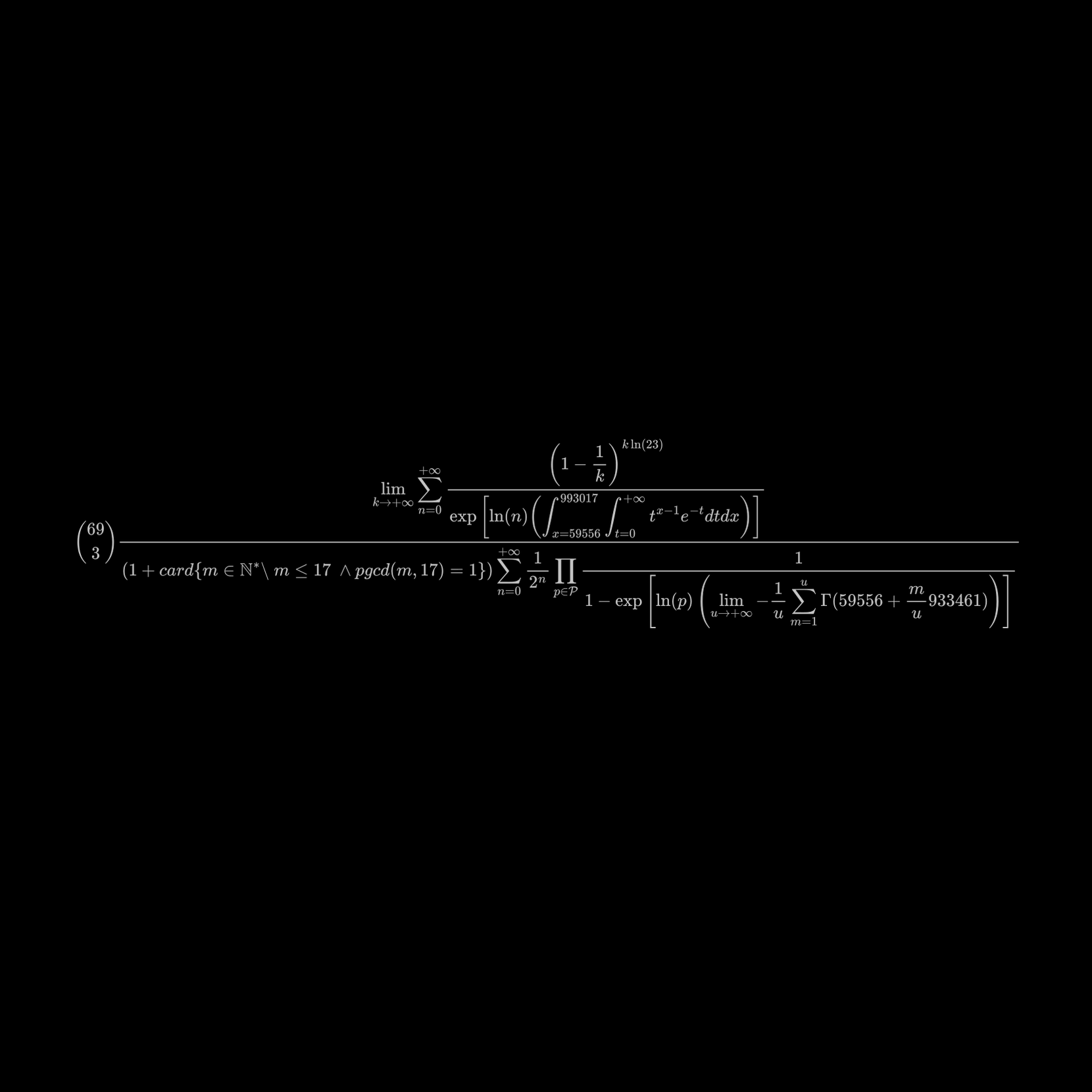 \binom{69}{3}\frac{\displaystyle \lim_{k \rightarrow +\infty}\displaystyle \left( 1 - \frac{1}{k} \right)^{k\ln(23)}\sum_{n = 0}^{+\infty}\frac{1}{n^s}}{\displaystyle (1 + card\{ m \in \mathbb N^* \backslash \ m \le 17 \ \wedge pgcd(m,17)=1\}) \sum_{n=0}^{+\infty} \frac{1}{2^n} \prod_{p \in \mathcal P}\frac{1}{1-p^{-s}}}